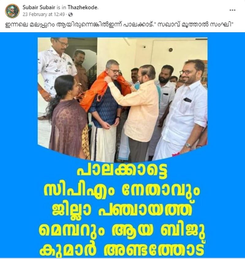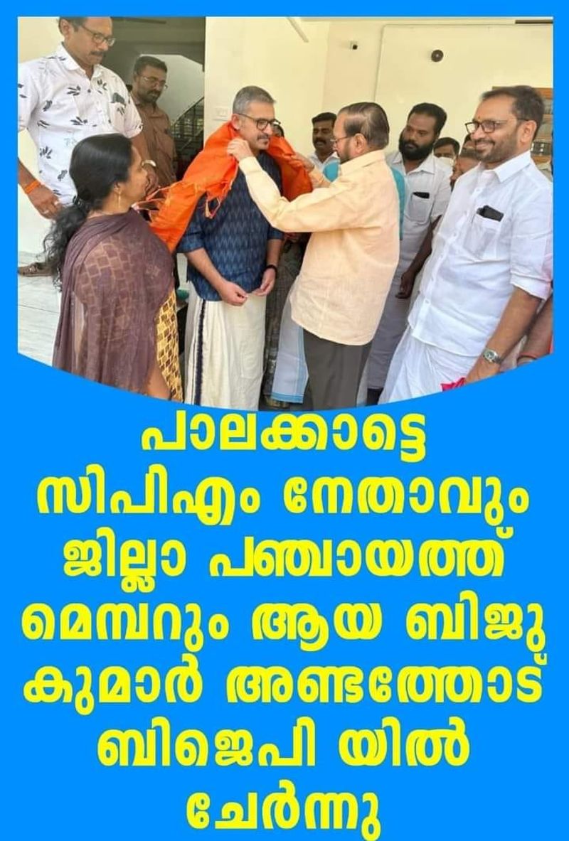 സിപിഎം നേതാവും പാലക്കാട് ജില്ലാ പഞ്ചായത്ത് മെമ്പറുമായ ബിജു കുമാര് അണ്ടത്തോട് ബിജെപിയില് ചേര്ന്നു എന്ന തരത്തില് ഫേസ്ബുക്കില് പ്രചരിക്കുന്ന ചിത്രം വ്യാജമാണ്.