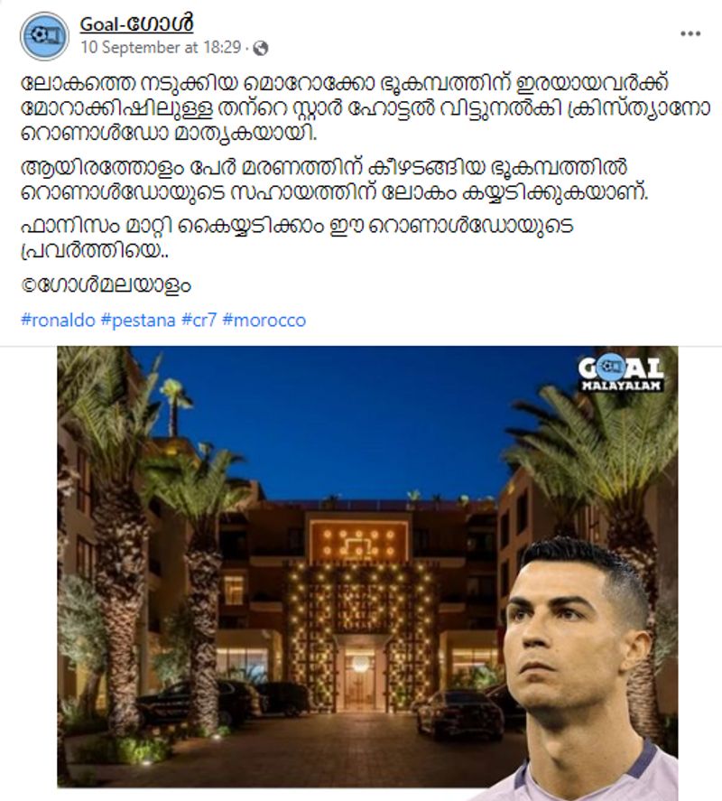 സോഷ്യല് മീഡിയയിലും വലിയ പ്രചാരമാണ് ഈ വാര്ത്ത നേടിയത്. 'ലോകത്തെ നടുക്കിയ മൊറോക്കോ ഭൂകമ്പത്തിന് ഇരയായവർക്ക് മരാക്കേഷിലുള്ള തന്റെ സ്റ്റാർ ഹോട്ടൽ വിട്ടുനൽകി ക്രിസ്റ്റ്യാനോ റൊണാൾഡോ മാതൃകയായി. ആയിരത്തോളം പേർ മരണത്തിന് കീഴടങ്ങിയ ഭൂകമ്പത്തിൽ റൊണാൾഡോയുടെ സഹായത്തിന് ലോകം കയ്യടിക്കുകയാണ്. ഫാനിസം മാറ്റി കൈയ്യടിക്കാം ഈ റൊണാൾഡോയുടെ പ്രവർത്തിയെ'... എന്നുമായിരുന്നു ഫേസ്ബുക്കില് പ്രത്യക്ഷപ്പെട്ട ഒരു പോസ്റ്റ്.