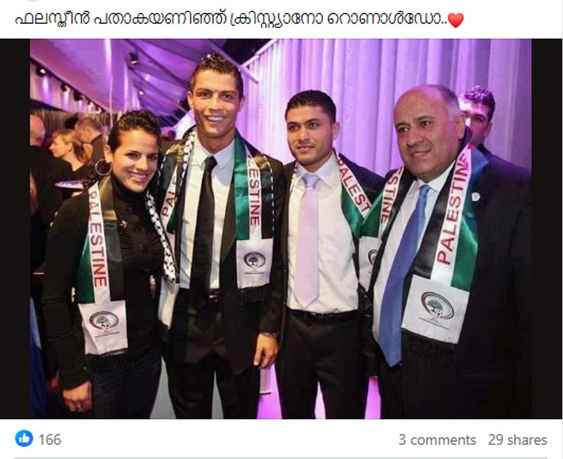 'പലസ്തീന് പതാകയണിഞ്ഞ് ക്രിസ്റ്റ്യാനോ റൊണാള്ഡോ' എന്ന് ഈ ചിത്രം കണ്ട് പറയാനാവില്ല. ഫിഫ അവാര്ഡിനിടെ 2009ല് പലസ്തീന് ഫുട്ബോള് അസോസിയേഷനും താരങ്ങള്ക്കുമൊപ്പം റോണോ പോസ് ചെയ്തതിന്റെ ചിത്രമാണിത്. ചിത്രത്തില് ക്രിസ്റ്റ്യാനോ ധരിച്ചിരിക്കുന്നത് പലസ്തീന് പതാകയല്ല, പലസ്തീന് ഫുട്ബോള് അസോസിയേഷന്റെ ലോഗോയുള്ള ഷാളാണ്. സമാനമായി സിആര്7 ഇസ്രയേല് മന്ത്രി അടക്കമുള്ളവരുമായി മുമ്പ് ഫോട്ടോയ്ക്ക് പോസ് ചെയ്തിട്ടുണ്ട് എന്നും വ്യക്തമായിട്ടുണ്ട്.