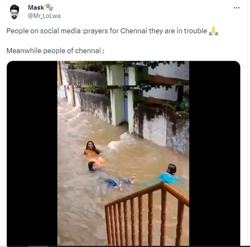 'സാമൂഹ്യമാധ്യമങ്ങളില് ആളുകള് ചെന്നൈക്കായി പ്രാര്ഥിക്കുമ്പോള് ചെന്നൈക്കാര് പ്രളയം ആഘോഷിക്കുകയാണ്' എന്ന് പറഞ്ഞാണ് വീഡിയോ സോഷ്യല് മീഡിയയില് പ്രചരിക്കുന്നത്. മിസ്റ്റര് ലോല്വ എന്ന ട്വിറ്റര് യൂസര് 2023 ഡിസംബര് അഞ്ചിന് ട്വീറ്റ് ചെയ്ത വീഡിയോ ഇതിനകം ലക്ഷക്കണക്കിന് പേര് കണ്ടുകഴിഞ്ഞു. ഒഴുകുന്ന വെള്ളത്തില് പലരും വാട്ടര്തീം പാര്ക്കുകള് പോലെ ഉല്ലസിക്കുന്നതും നീന്തുന്നതുമാണ് വീഡിയോയില് കാണുന്നത്. ഇതേ വീഡിയോ മറ്റ് നിരവധി പേരും സോഷ്യല് മീഡിയയില് പങ്കുവെച്ചിട്ടുണ്ട്. പ്രളയം പോലും ചെന്നൈയിലെ ഒരു കൂട്ടര് മതിമറന്ന് ആഘോഷിക്കുകയാണ് എന്നാണ് വീഡിയോ ഷെയര് ചെയ്യുന്നവര് വിമര്ശിക്കുന്നത്. എന്താണ് ഈ വീഡിയോയുടെ സത്യാവസ്ഥ.