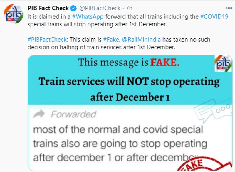 'ഇന്ത്യന് റെയില്വേ കൊവിഡ് സ്പെഷ്യലുകള് ഉള്പ്പടെ എല്ലാ ട്രെയിന് സര്വീസുകളും ഡിസംബര് 1ന് ശേഷം നിര്ത്തിവെക്കും' എന്നാണ് വാട്സ്ആപ്പില് പ്രചരിക്കുന്ന സന്ദേശത്തിലുള്ളത്. യാത്രക്കായി മുന്കൂട്ടി ടിക്കറ്റുകള് ബുക്ക് ചെയ്ത് കാത്തിരിക്കുന്നവരുള്പ്പടെ നിരവധിയാളുകള് ഇതോടെ ആശങ്കയിലായി. സന്ദേശം സത്യമാണോ എന്ന് തിരക്കി നിരവധി പേര് രംഗത്തെത്തി.
