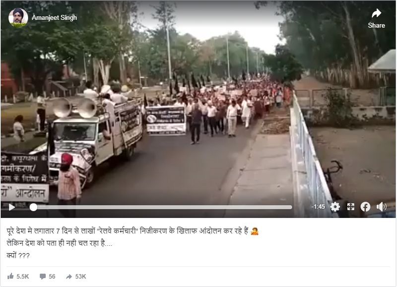 അമന്ജീത് സിംഗ് എന്ന ഫേസ്ബുക്ക് യൂസറാണ് ജൂലൈ 28ന് വീഡിയോ പോസ്റ്റ് ചെയ്തത്. റെയില്വേയിലെ സ്വകാര്യവല്ക്കരണത്തിനെതിരെ ദശലക്ഷക്കണക്കിന് തൊഴിലാളികള് കഴിഞ്ഞ ഏഴ് ദിവസമായി പ്രക്ഷോഭത്തിലാണ് എന്നാണ് വീഡിയോയ്ക്ക് ഒപ്പമുള്ള തലക്കെട്ടില് പറയുന്നത്. ഇതിനകം 18 ലക്ഷം പേര് വീഡിയോ കാണുകയും 50,000ത്തിലേറെ ഷെയര് ലഭിക്കുകയും ചെയ്തു.