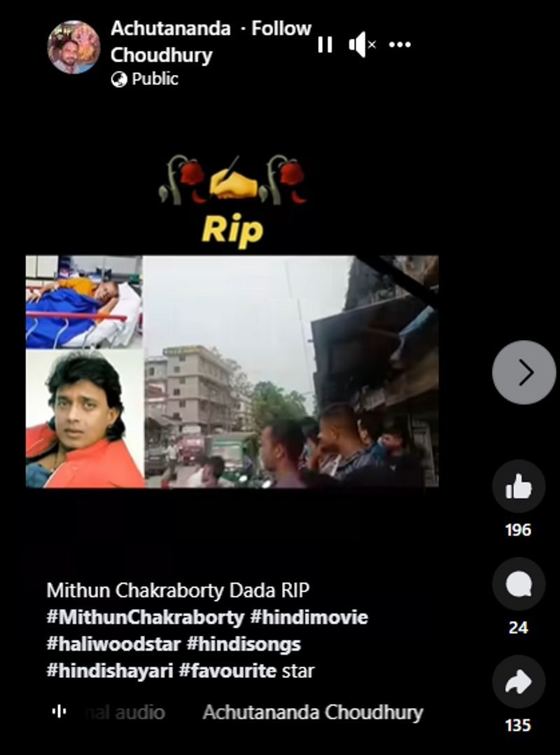 'പ്രമുഖ ഇന്ത്യന് നടന് മിഥുന് ചക്രബര്ത്തി വിടവാങ്ങി. മിഥുന് ചക്രബര്ത്തിക്ക് ആദരാഞ്ജലികള്' എന്നിങ്ങനെയുള്ള തലക്കെട്ടുകളോടെയാണ് ചരമ വാര്ത്ത ഫേസ്ബുക്കില് വ്യാപകമായി പ്രചരിക്കുന്നത്. മിഥുന് ചക്രബര്ത്തി ആശുപത്രിയില് കിടക്കുന്നത് അടക്കമുള്ള ചിത്രങ്ങള് സഹിതമുള്ള റീല്സാണ് പലരും ഷെയര് ചെയ്യുന്നത്.