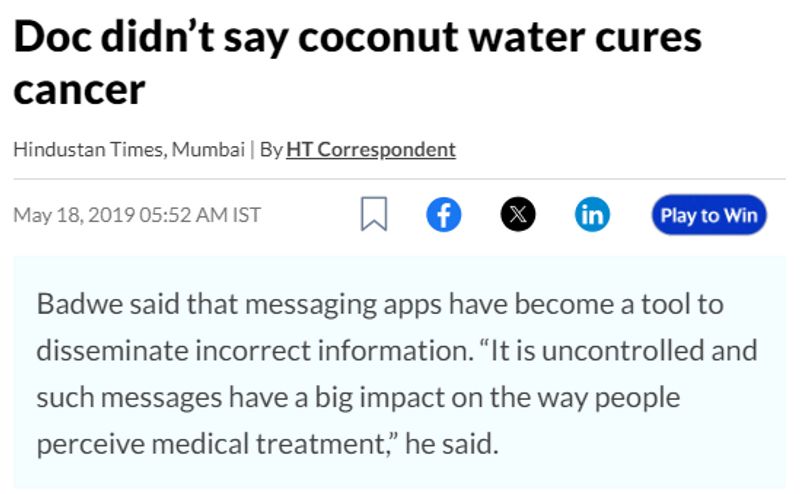 ഈ വാട്സ്ആപ്പ് മെസേജ് സത്യമാണോ എന്നറിയാന് കീവേഡ് സെര്ച്ച് നടത്തുകയാണ് ആദ്യം ചെയ്തത്. ഈ പരിശോധനയില് ദേശീയ മാധ്യമമായ ഹിന്ദുസ്ഥാന് ടൈംസ് 2019 മെയ് 18ന് പ്രസിദ്ധീകരിച്ച വാര്ത്ത ലഭിക്കുകയുണ്ടായി. ഡോ. രാജേന്ദ്ര ബഡ്വെ ചൂട് തേങ്ങാവെള്ളം ക്യാന്സര് മാറ്റുമെന്ന് എവിടെയും പറഞ്ഞിട്ടില്ലെന്നും അദേഹത്തിന്റെ പ്രസ്താവനയായി പ്രചരിക്കുന്ന കുറിപ്പ് വ്യാജമാണ് എന്നും ടാറ്റ മെമ്മോറിയല് ആശുപത്രി വ്യക്തമാക്കിയതായാണ് ഹിന്ദുസ്ഥാന് ടൈംസ് വാര്ത്ത. ഇതോടെ ഇപ്പോള് ചൂട് തേങ്ങാവെള്ളത്തെ കുറിച്ച് പ്രചരിക്കുന്ന സന്ദേശം വ്യാജമാണെന്നും പഴയതാണ് എന്നും വ്യക്തമായി.