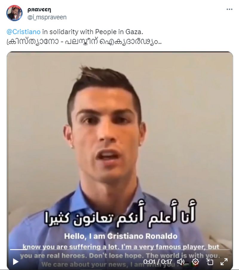 ക്രിസ്റ്റ്യാനോ റൊണാള്ഡോ ക്യാമറയ്ക്ക് മുന്നിലിരുന്ന് സംസാരിക്കുന്നതായുള്ള വീഡിയോയാണ് എക്സില് പ്രചരിക്കുന്നത്. 'Cristiano in solidarity with People in Gaza. ക്രിസ്റ്റ്യാനോ- പലസ്തീന് ഐക്യദാർഢ്യം' എന്ന കുറിപ്പോടെ പ്രവീണ് എന്ന യൂസര് 17 സെക്കന്ഡ് ദൈര്ഘ്യമുള്ള വീഡിയോ ട്വീറ്റ് ചെയ്തിട്ടുള്ളതായി കാണാം. 2023 ഒക്ടോബര് 18-ാം തിയതിയാണ് ഈ ട്വീറ്റ് പ്രത്യക്ഷപ്പെട്ടത്.