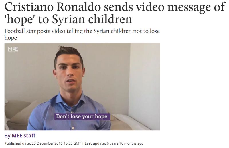 കാരണം- 2: ക്രിസ്റ്റ്യാനോയുടെതായി പ്രചരിക്കുന്ന വീഡിയോയുടെ ഫ്രെയിമുകള് റിവേഴ്സ് ഇമേജ് സെര്ച്ചിന് വിധേയമാക്കിയപ്പോള് 2016 ഡിസംബര് 23ന് മിഡില് ഈസ്റ്റ് ഐ എന്ന മാധ്യമം ഈ വീഡിയോ സഹിതം വാര്ത്ത നല്കിയത് കണ്ടെത്താനായി. ഈ വീഡിയോയുടെ തുടക്കത്തില് ക്രിസ്റ്റ്യാനോ പറയുന്നുണ്ട് ഇത് സിറിയയിലെ കുട്ടികള്ക്കുള്ള തന്റെ സന്ദേശമാണ് എന്ന്. 'ക്രിസ്റ്റ്യാനോ റൊണാള്ഡോ സിറിയയിലെ കുട്ടികള്ക്ക് പ്രതീക്ഷയുടെ സന്ദേശം കൈമാറി' എന്നാണ് ഈ വാര്ത്തയ്ക്ക് നല്കിയിരിക്കുന്ന തലക്കെട്ട്.