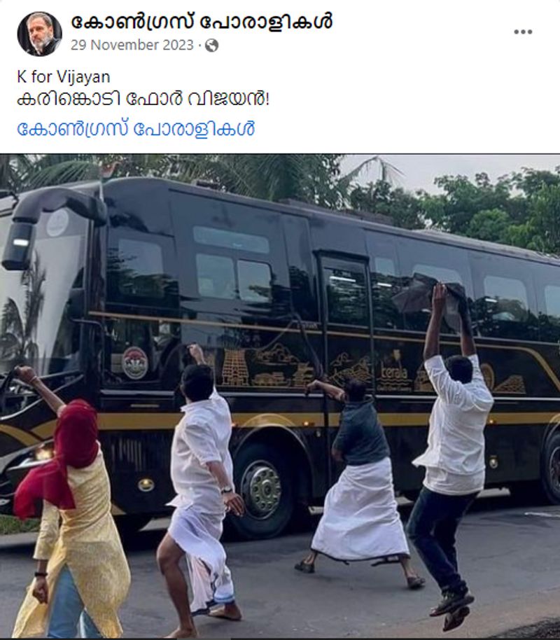 നവകേരള സദസിനുപയോഗിച്ച ബസിന് നേര്ക്ക് യൂത്ത് ലീഗ് കരിങ്കൊടി കാണിച്ചതായി എന്തെങ്കിലും വാര്ത്തയുണ്ടോ എന്നാണ് ആദ്യം അന്വേഷിച്ചത്. എന്നാല് ഈ പരിശോധനയില് ഇത്തരം വാര്ത്തകളൊന്നും കണ്ടെത്താനായില്ല. ഇതോടെ ചിത്രത്തിന്റെ ഉറവിടം അറിയാന് ഫോട്ടോ റിവേഴ്സ് ഇമേജ് സെര്ച്ചിന് വിധേയമാക്കി. ഈ പരിശോധനയില് ഇപ്പോഴത്തേത് എന്ന പേരില് പ്രചരിക്കുന്ന ചിത്രം പഴയതാണ് എന്ന് ബോധ്യപ്പെട്ടു. 2023 നവംബര് 29ന് കോൺഗ്രസ് പോരാളികൾ എന്ന ഫേസ്ബുക്ക് പേജില് ചിത്രം പോസ്റ്റ് ചെയ്തിരുന്നതാണ് എന്ന് പരിശോധനയില് തെളിഞ്ഞു.