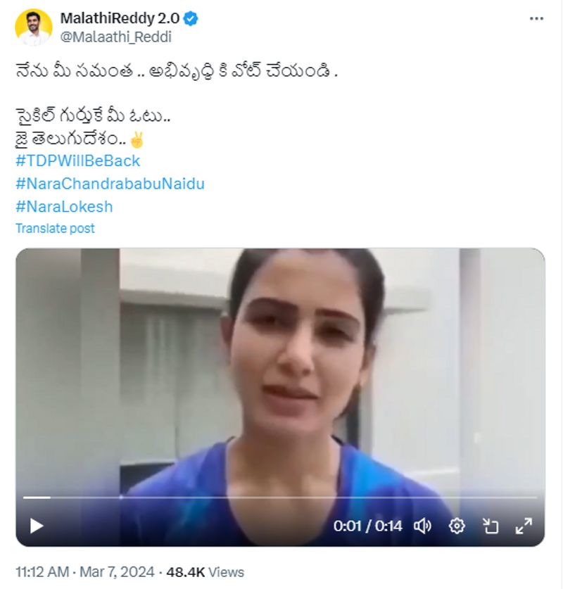 'ഞാന് സാമന്തയാണ്, സൈക്കിള് ചിഹ്നത്തിന് വോട്ട് ചെയ്യുക'- എന്നും സാമന്ത പറയുന്നതായാണ് 14 സെക്കന്ഡ് ദൈര്ഘ്യമുള്ള വീഡിയോയില് കാണുന്നത്. 'വികസനത്തിനായി വോട്ട് ചെയ്യൂ, സൈക്കിള് ചിഹ്നത്തില് വോട്ട് ചെയ്യൂ' എന്ന തലക്കെട്ടോടെ വീഡിയോ വെരിഫൈഡ് എക്സ് (പഴയ ട്വിറ്റര്) അക്കൗണ്ടുകളില് നിന്നടക്കം ട്വീറ്റ് ചെയ്തിരിക്കുന്നതായി കാണാം. #TDPWillBeBack #NaraChandrababuNaidu #NaraLokesh എന്നീ ഹാഷ്ടാഗുകളോടെയാണ് വീഡിയോ ട്വീറ്റ് ചെയ്തിരിക്കുന്നത്. എന്നാല് വിവിധ ഫ്രെയിമുകള് എഡിറ്റ് ചെയ്താണ് വീഡിയോ നിര്മിച്ചിരിക്കുന്നത്.