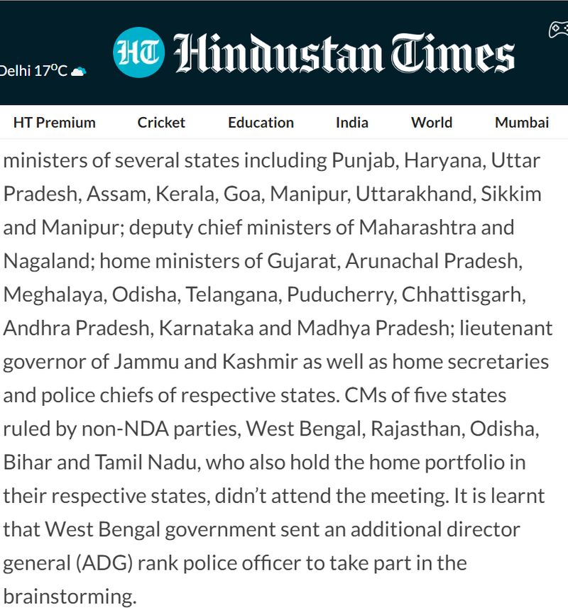 അതേസമയം 2022 ഒക്ടോബറില് ബിജെപി/എന്ഡിഎ ഇതര സർക്കാരുകളുള്ള പശ്ചിമ ബംഗാള്, രാജസ്ഥാന്, ഒഡിഷ, ബിഹാർ, തമിഴ്നാട് എന്നിവിടങ്ങളിലെ ആഭ്യന്തര വകുപ്പ് കൂടി കൈകാര്യം ചെയ്യുന്ന മുഖ്യമന്ത്രിമാർ യോഗത്തിനെത്തിയില്ല. എന്നാല് ബംഗാള് ഉള്പ്പടെയുള്ള സംസ്ഥാനങ്ങള് ആഭ്യന്തര മന്ത്രി കൂടിയായ മുഖ്യമന്ത്രിക്ക് പങ്കെടുക്കാന് കഴിയാത്ത സാഹചര്യത്തില് മുതിർന്ന ഉദ്യോഗസ്ഥരെ യോഗത്തിന് അയച്ചു. എന്ഡിഎ ഇതര സംസ്ഥാനങ്ങളിലെ മുഖ്യമന്ത്രിമാരെല്ലാം യോഗം ബഹിഷ്കരിച്ചിരുന്നു എന്ന പ്രചാരണം അതിനാല് തന്നെ വസ്തുതാവിരുദ്ധമാണ്.