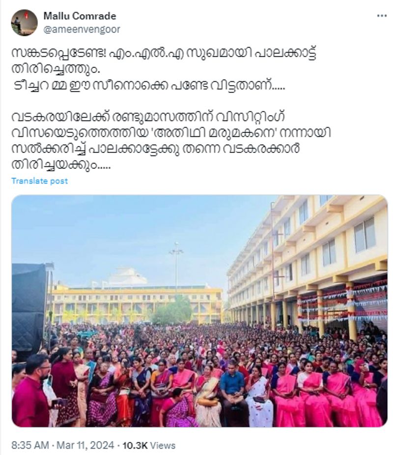 സജില് സാജു എന്ന ഫേസ്ബുക്ക് യൂസര് 2024 മാര്ച്ച് 10ന് ചിത്രം സഹിതം പങ്കുവെച്ച പോസ്റ്റ് ഇങ്ങനെ. 'ഷാഫിയുടെ ഷോ വർക്ക് ഗംഭീരമാക്കുന്ന മാധ്യമങ്ങളോടാണ്...പതിനായിരക്കണക്കിന് സ്ത്രീകൾ അണിനിരന്ന സംഗമങ്ങൾ ശൈലജ ടീച്ചർക്ക് വേണ്ടി ഇടതുപക്ഷം നടത്തിയിട്ടുണ്ട്...നിങ്ങൾ കാണാതെ നടിച്ചാലും ഞങ്ങൾ അത് കാണിച്ചു കൊണ്ടേ ഇരിക്കും...'- എന്നുമാണ് സജില് സാജുവിന്റെ എഫ്ബി പോസ്റ്റിലുള്ളത്.