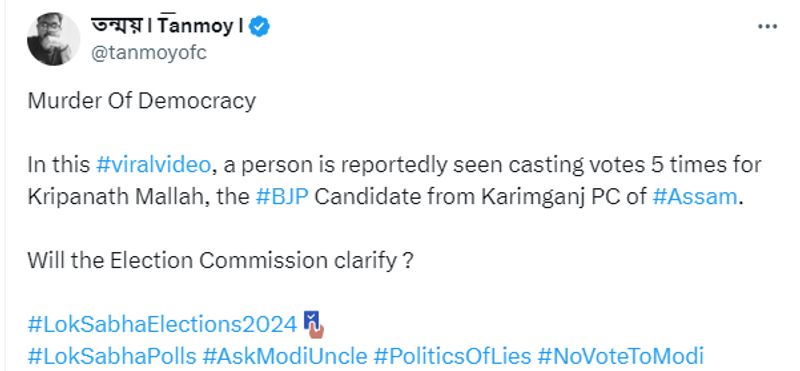 ഒരേ വ്യക്തി ബിജെപി സ്ഥാനാര്ഥിക്ക് തുടര്ച്ചയായി അഞ്ച് വോട്ടുകള് ചെയ്യുന്ന വീഡിയോ എന്ന ആരോപണത്തോടെയാണ് ദൃശ്യങ്ങള് സാമൂഹ്യമാധ്യമങ്ങളില് പ്രചരിക്കുന്നത്. 'ജനാധിപത്യത്തിന്റെ അന്ത്യം, അസമിലെ കരിംഗഞ്ച് പാര്ലമെന്റ് മണ്ഡലത്തിലെ പോളിംഗ് ബൂത്തില് ബിജെപി സ്ഥാനാര്ഥി ക്രിപാനാഥ് മല്ലായ്ക്കായി ഒരു സമ്മതിദായകന് അഞ്ച് വോട്ടുകള് ചെയ്യുന്നു' എന്ന കുറിപ്പോടെയാണ് വീഡിയോ സാമൂഹ്യമാധ്യമമായ എക്സില് പോസ്റ്റ് ചെയ്തിരിക്കുന്നത്. ഇക്കാര്യത്തില് ഇലക്ഷന് കമ്മീഷന് വിശദീകരണം നല്കുമോ എന്ന ചോദ്യവും ട്വീറ്റിനൊപ്പം കാണാം.