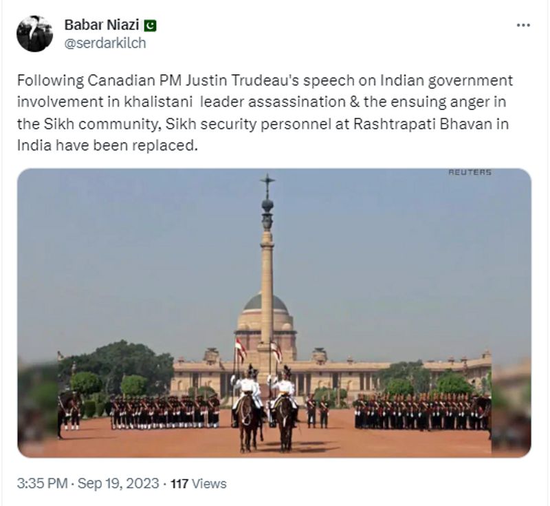സിഖ് നേതാവ് ഹർദീപ് സിംഗിന്റെ കൊലപാതകത്തിൽ ഇന്ത്യൻ സർക്കാരിന് പങ്കുണ്ടെന്ന് കനേഡിയൻ പ്രധാനമന്ത്രി ജസ്റ്റിൻ ട്രൂഡോ ആരോപിച്ചിരുന്നു. ഇതോടെ രാജ്യത്തെ സിഖ് സമുദായം രോഷാകുലരാണെന്ന് ദലിത് ഒഫീഷ്യൽ എന്ന ഹാൻഡിൽ നടത്തുന്ന പ്രകാശ് കുമാർ ഭിൽ വ്യാജ വിവരം ട്വീറ്റ് ചെയ്യുകയായിരുന്നു. ഈ പ്രത്യേക സാഹചര്യം കണക്കിലെടുത്ത് സിഖ് സുരക്ഷാ ഗാർഡുകളെ രാഷ്ട്രപതി ഭവനിൽ നിന്ന് നീക്കം ചെയ്തതായും അപേക്ഷിച്ചിട്ടും സിഖ് സൈനികർക്ക് അവധി നൽകുന്നില്ല എന്നും പ്രകാശ് കുമാർ ഭില്ലിന്റെ ട്വീറ്റിലുണ്ടായിരുന്നു. (ഭില്ലിന്റെ ട്വീറ്റ് ഇപ്പോള് ലഭ്യമല്ല). മറ്റ് നിരവധി ട്വീറ്റുകളും ഇതേ പ്രചാരണവുമായി കാണാം.