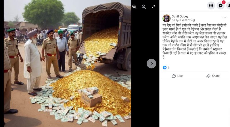 ജാര്ഖണ്ഡില് ഒരു ട്രക്കില് കടത്തുകയായിരുന്ന സ്വര്ണനാണയങ്ങളും നോട്ടുകളും പിടികൂടിയെന്നാണ് ചിത്രം സഹിതമുള്ള ഫേസ്ബുക്ക് പോസ്റ്റുകളില് പറയുന്നത്. ട്രക്കില് നിന്ന് വലിച്ച് പുറത്തിട്ടനിലയില് പണത്തിന്റെയും സ്വര്ണനായണത്തിന്റെയും ശേഖരം ഫോട്ടോയില് കാണാം. ഇതിന് സമീപം ചില പൊലീസ് ഉദ്യോഗസ്ഥര് നില്ക്കുന്നതും ചിത്രത്തിലുണ്ട്.