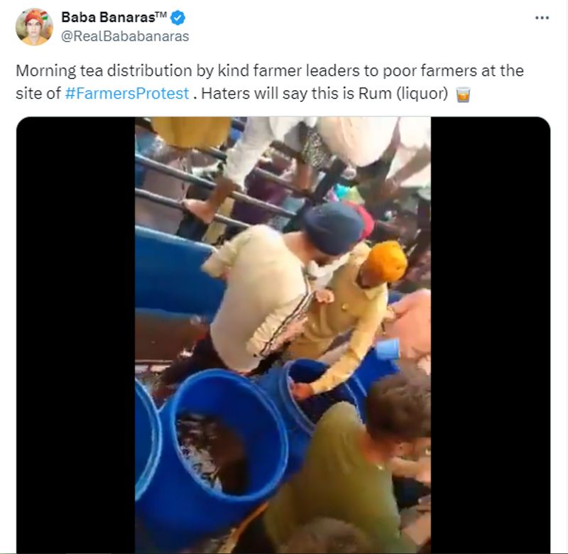 'കര്ഷക സമര സ്ഥലത്ത് രാവിലത്തെ ചായയായി മദ്യം വിതരണം ചെയ്യുന്നു, വിമര്ശകര് പറയും ഇത് റം ആണെന്ന്'- ഈ തലക്കെട്ടോടെയാണ് ബാബാ ബനാറസ് എന്ന വെരിഫൈഡ് എക്സ് ഹാന്ഡിലില് നിന്ന് 2024 ഫെബ്രുവരി 17ന് വീഡിയോ പ്രത്യക്ഷപ്പെട്ടിരിക്കുന്നത്. അറുപതിനായിരത്തിലേറെ ആളുകള് ഈ വീഡിയോ ഇതിനകം കണ്ടു. വലിയ ബാരലുകളില് നിറച്ചിരിക്കുന്ന മദ്യം വിതരണം ചെയ്യുന്നതും അത് വാങ്ങാന് ഗ്ലാസുമായി ആളുകള് തിക്കും തിരക്കും കൂട്ടുന്നതുമാണ് 23 സെക്കന്ഡ് ദൈര്ഘ്യമുള്ള വീഡിയോയില് കാണുന്നത്.