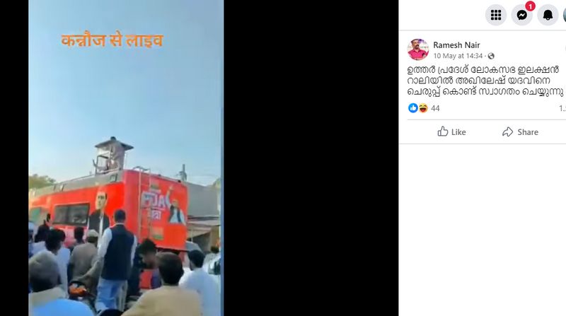 'ഉത്തർപ്രദേശ് ലോക്സഭ ഇലക്ഷൻ റാലിയിൽ അഖിലേഷ് യാദവിനെ ചെരുപ്പ് കൊണ്ട് സ്വാഗതം ചെയ്യുന്നു'- എന്ന തലക്കെട്ടോടെയാണ് സെക്കന്ഡുകള് മാത്രം ദൈര്ഘ്യമുള്ള വീഡിയോ ഒരാള് ഫേസ്ബുക്കില് പോസ്റ്റ് ചെയ്തിരിക്കുന്നത്. സമാന വീഡിയോ അഖിലേഷിന് ചെരുപ്പേറ് കിട്ടി എന്ന ആരോപണത്തോടെ മറ്റ് നിരവധിയാളുകളും എഫ്ബിയില് പങ്കുവെച്ചിട്ടുണ്ട്. അഖിലേഷ് യാദവിന് ചെരുപ്പേറ് കിട്ടി എന്നാണ് വീഡിയോ ഷെയര് ചെയ്തവരെല്ലാം അവകാശപ്പെടുന്നത്. പ്രചാരണ വാഹനത്തിന് മുകളില് നിന്ന് അണികളെ അഭിസംബോധന ചെയ്യുന്ന അഖിലേഷിന് നേര്ക്ക് എന്തൊക്കയോ എറിയുന്നത് വീഡിയോയില് വ്യക്തം. വൈറല് വീഡിയോ ചുവടെ കാണാം.