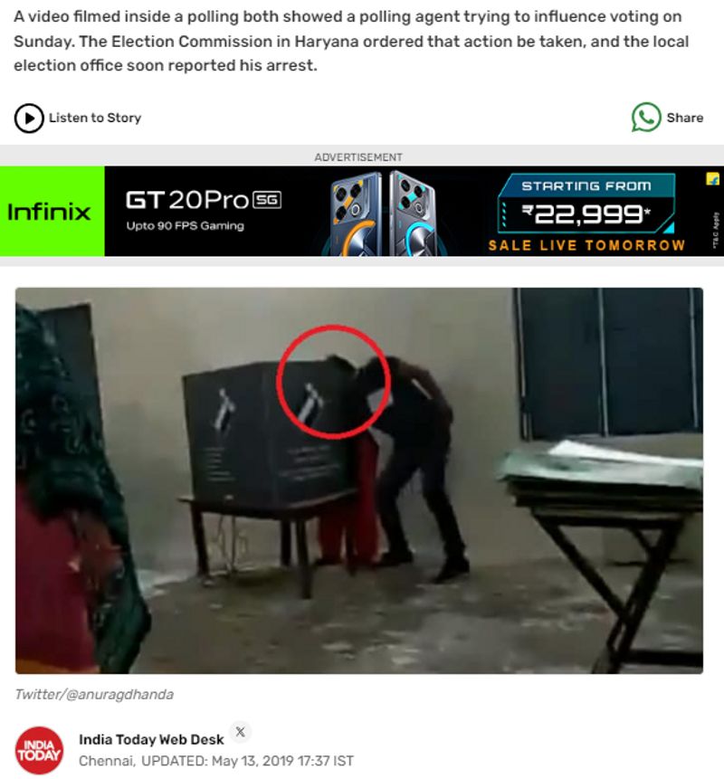 2019 മെയ് 13ന് ഈ സംഭവത്തിന്റെ വാര്ത്ത ദേശീയ മാധ്യമമായ ഇന്ത്യാ ടുഡേ റിപ്പോര്ട്ട് ചെയ്തിരുന്നു. കുറഞ്ഞത് മൂന്ന് വോട്ടര്മാരെയെങ്കിലും സ്വാധീനിക്കാന് ശ്രമിച്ച പോളിംഗ് ഏജന്റിനെ പിടികൂടി എന്ന രീതിയിലാണ് ഫരീദാബാദ് ജില്ലാ തെരഞ്ഞെടുപ്പ് ഓഫീസിനെ ഉദ്ധരിച്ച് ഇന്ത്യാ ടുഡേയുടെ വാര്ത്ത. അന്നും ഈ വീഡിയോ വൈറലായിരുന്നു.