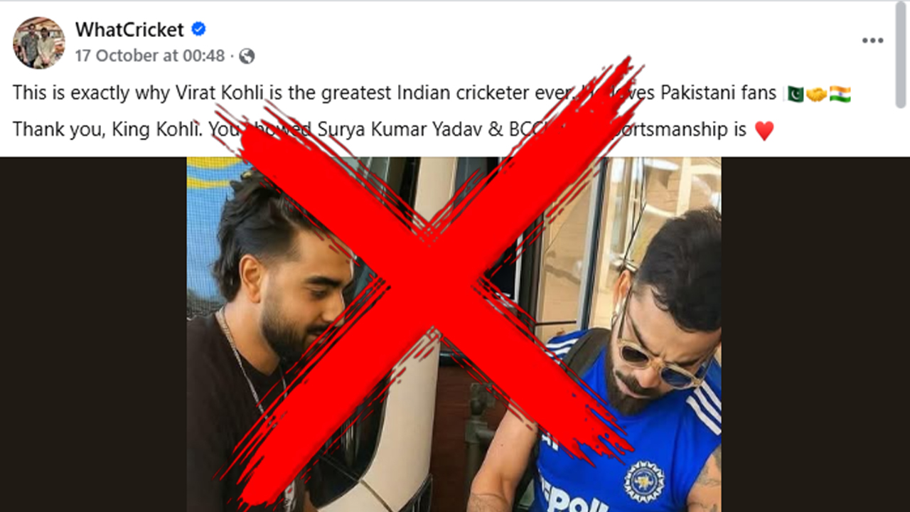 ഇന്ത്യന് ക്രിക്കറ്റ് താരം വിരാട് കോലി ഒരു ആരാധകന് പാക് പതാകയില് ഓട്ടോഗ്രാഫ് നല്കിയോ? കോലി പാക് പതാകയില് ഓട്ടോഗ്രാഫ് നല്കി എന്നവകാശപ്പെടുന്ന ഒരു ചിത്രം പങ്കുവെച്ചിരിക്കുകയാണ് 'വാട്ട് ക്രിക്കറ്റ്' എന്ന ഫേസ്ബുക്ക് അക്കൗണ്ട്. 'കോലിയാണ് എക്കാലത്തെയും മികച്ച ഇന്ത്യന് ക്രിക്കറ്റര്. കോലി പാകിസ്ഥാന് ആരാധകരെ സ്നേഹിക്കുന്നു, നന്ദി കോലി, സ്പോര്ട്സ്മാന്ഷിപ്പ് എന്താണെന്ന് സൂര്യകുമാര് യാദവിനെയും ബിസിസിഐയെയും കോലി പഠിപ്പിക്കുന്നു'- എന്നും എഫ്ബി പോസ്റ്റില് പറയുന്നു.