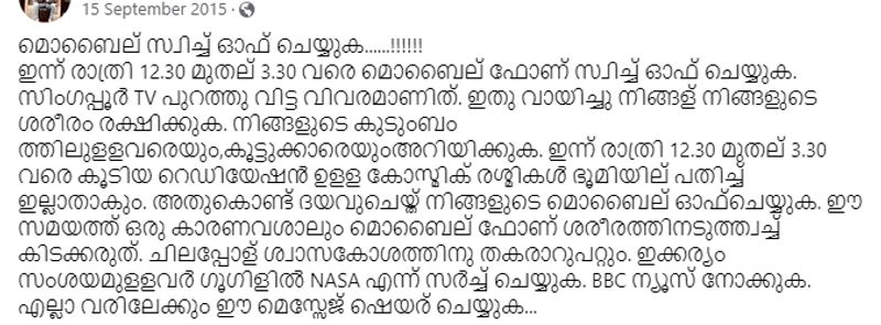 'ഇന്നു രാത്രി 12:30 മുതൽ 3:30 വരെ മൊബൈൽ സ്വിച്ച് ഓഫ് ചെയ്യുക വളരെ നിർബന്ധമായും = .സിംഗാപ്പൂർ ടിവി പുറത്തു വിട്ട വിവരമാണിത് .ഇതു വായിച്ചു നിങ്ങൾ നിങ്ങ്ളുടെ ശരീരം രക്ഷിക്കുക. നിങ്ങളുടെ കുടുംബത്തിൽ ഉള്ളവരെയും കൂട്ടുക്കാരെയും അറിയിക്കുക .ഇന്നു രാത്രി 12;30 മുതൽ 3:30 വരെ അപകടമായ വളരെ കൂടിയ റെഡിയേഷൻ ഉള്ള കോസ്മിക്ക് രശ്മികൾ ഭൂമിയിൽ വന്നു പതിച്ച് ഇല്ലാതാവും .അതുക്കൊണ്ട് ദയവു ചെയ്തു നിങ്ങളുടെ മൊബൈൽ ഓഫ് ചെയ്യുക .ഈ സമയം ഒരു കാരണവശാലും മൊബൈൽ ശരീരത്തിന് അടുത്ത് വെച്ച് കിടക്കരുത് ചിലപ്പോൾ ശ്വാസകോശത്തിന് തകരാർ പറ്റും .സംശയം ഉള്ളവർ ഗൂഗിളിൽ NASA എന്ന് സെർച്ച് ചെയ്യുക .BBC ന്യൂസ് നോക്കുക. എല്ലാവരിലേക്കും ഈ മെസ്സേജ് എത്തിക്കുക'.
