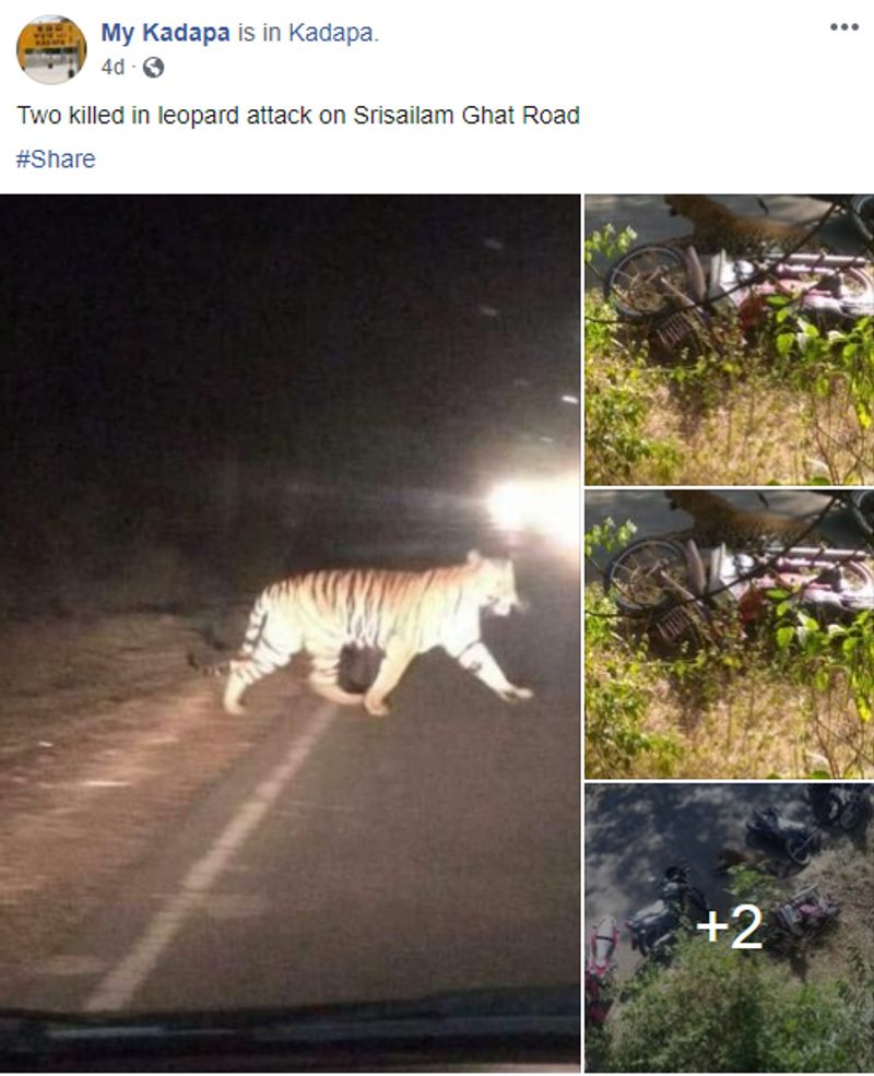ഹൈദരാബാദ്: പുള്ളിപ്പുലിയുടേയും കടുവയുടേയും ആക്രമണം കേരളത്തിന് അത്ര പുതിയ കേള്വിയല്ല. മലയാര മേഖലകളില് വന്യമൃഗങ്ങളുടെ ആക്രമണത്തിന് വിധേയരായി നിരവധി ജീവനുകള് കേരളത്തില് പൊലിഞ്ഞിട്ടുണ്ട്. സമാനമായി ഹൈദരാബാദ്- ശ്രീശൈലം പാതയില് രണ്ടുപേരെ പുള്ളിപ്പുലി ആക്രമിച്ചു കൊന്നോ?. സാമൂഹ്യമാധ്യമങ്ങളില് പ്രചരിക്കുന്ന ചിത്രങ്ങളാണ് സംശയം ജനിപ്പിക്കുന്നത്.