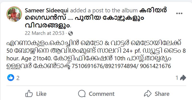 'എറണാകുളം.കൊച്ചിൻ മെട്രോ & വാട്ടർ മെട്രോയിലേക്ക് 50 ബോയ്സിനെ ആവിശംമുണ്ട് സാലറി 24+ pf. ഡ്യൂട്ടി ടൈം 8 hour. Age 21to40. കോളിഫിക്കേഷൻ 10th പാസ്സ്.താല്പര്യം ഉള്ളവർ കോൺടാക്ട് 7510691676/8921974894/ 9061421676'- എന്നുമാണ് വൈറലായിരിക്കുന്ന വാട്സ്ആപ്പ് സന്ദേശത്തിലുള്ളത്. അതിന്റെ സ്ക്രീന്ഷോട്ട് ചുവടെ കാണാം.