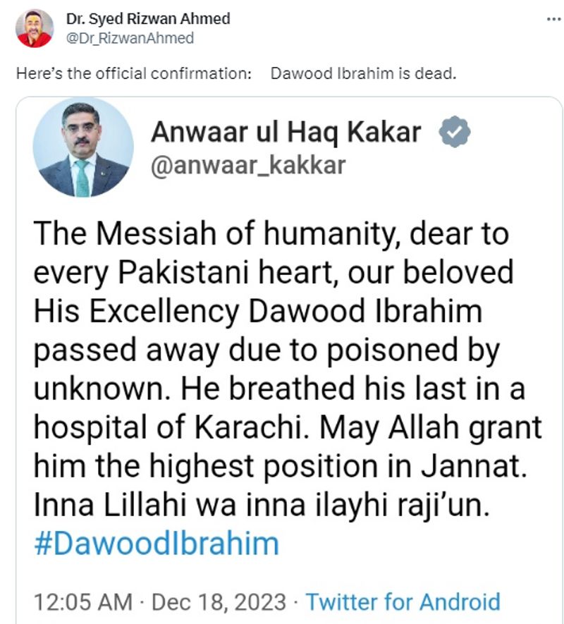 പാകിസ്ഥാനിലെ കാവൽ പ്രധാനമന്ത്രി അന്വാര് ഉള് ഹഖ് കകറിന്റെ ഔദ്യോഗിക എക്സ് അക്കൗണ്ടില് നിന്നുള്ള ട്വീറ്റ് എന്ന തരത്തിലാണ് ദാവൂദ് ഇബ്രാഹിമിന്റെ മരണത്തെ കുറിച്ച് സ്ക്രീന്ഷോട്ട് സാമൂഹ്യമാധ്യമങ്ങളില് പ്രചരിക്കുന്നത്. നിരവധി പേര് എക്സില് ഈ സ്ക്രീന്ഷോട്ട് ഷെയര് ചെയ്തു. ദാവൂദ് മരിച്ചതായി 2023 ഡിസംബര് 18ന് പാക് കാവല് പ്രധാനമന്ത്രി ട്വീറ്റ് ചെയ്തതായാണ് സ്ക്രീന്ഷോട്ടില് കാണുന്നത്. 'അജ്ഞാതര് വിഷം നല്കിയതിനെ തുടര്ന്ന് ദാവൂദ് ഇബ്രാഹിം മരണമടഞ്ഞു. കറാച്ചിയില് വച്ചാണ് ദാവൂദിന്റെ മരണം' എന്നും അന്വാര് ഉള് ഹഖ് ട്വീറ്റ് ചെയ്തതായി പ്രചരിക്കുന്ന സ്ക്രീന്ഷോട്ടിലുണ്ട്. ഈ ട്വീറ്റില് ദാവൂദിനെ 'മനുഷ്യത്വത്തിന്റെ മിശിഹാ' എന്ന് അന്വാര് ഉള് ഹഖ് വിശേഷിപ്പിച്ചതായി കാണുന്നത് വലിയ വിവാദമാവുകയും ചെയ്തു.