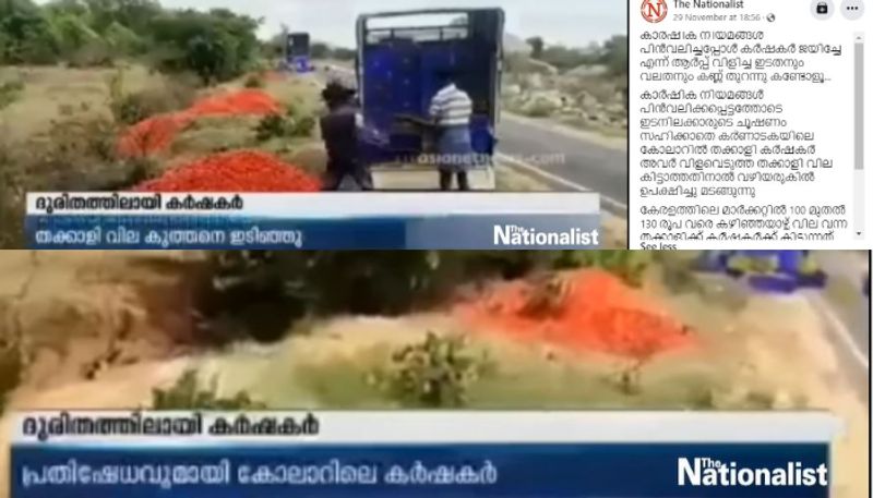 ഈ വര്ഷം മെയ് മാസത്തില് കര്ണാടകയില് തക്കാളി വില ഇടിഞ്ഞതിനേ തുടര്ന്ന് വില്ക്കാനാവാതെ വന്നതോടെ കിലോക്കണക്കിന് തക്കാളിയാണ് കര്ഷകര് വഴിയില് തള്ളിയത്. ഈ വാര്ത്തയുടെ ദൃശ്യങ്ങളാണ് കാര്ഷിക നിയമങ്ങള് പിന്വലിക്കാന് പ്രതിഷേധിച്ചവര്ക്കെതിരെയുള്ള പ്രചാരണത്തിന് ആയുധമാക്കിയിട്ടുള്ളത്. കാര്ഷിക നിയമങ്ങള് പ്രാവര്ത്തികമായിരുന്നെങ്കില് കര്ഷകര്ക്ക് വിലകിട്ടിയേനെ എന്ന നിലയില് ഈ ദൃശ്യങ്ങള് ഉപയോഗിച്ചുള്ള പ്രചാരണം തെറ്റാണ്. കോലാറില് നിന്നുള്ള ഈ ദൃശ്യങ്ങള് കാര്ഷിക നിയമങ്ങള് പിന്വലിക്കുന്നതിന് ഏറെ മുന്പുള്ളതാണ്.