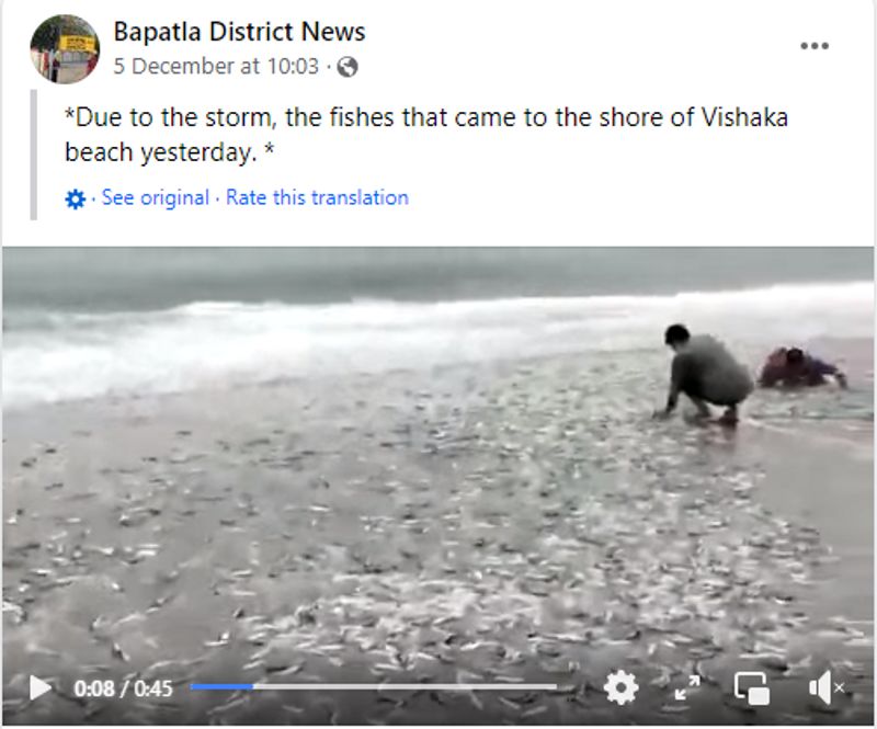 Bapatla District News എന്ന ഫേസ്ബുക്ക് പേജില് 2023 ഡിസംബര് അഞ്ചിന് അപ്ലോഡ് ചെയ്തിരിക്കുന്ന 45 സെക്കന്ഡ് വീഡിയോയുടെ തലക്കെട്ട് ഇങ്ങനെ- 'കാറ്റ് കാരണം വിശാഖ തീരത്ത് മീനുകള് ഇന്നലെയെത്തിയിരിക്കുന്നു'. തിരയ്ക്കൊപ്പം നൂറുകണക്കിന് മീനുകള് കരയിലേക്ക് ഇരച്ചെത്തുന്നത് വീഡിയോയില് കാണാം. ചുരുക്കം ആളുകള് ഈ മീനുകളെ വാരിയെടുത്ത് കവറിലാക്കുന്നുമുണ്ട്. വീഡിയോ നിരവധി പേര് ഈ എഫ്ബി പേജില് നിന്ന് ഷെയര് ചെയ്തിട്ടുണ്ട്. ഈ പശ്ചാത്തലത്തില് ദൃശ്യത്തിന്റെ വസ്തുത എന്താണ് എന്ന് പരിശോധിക്കാം.