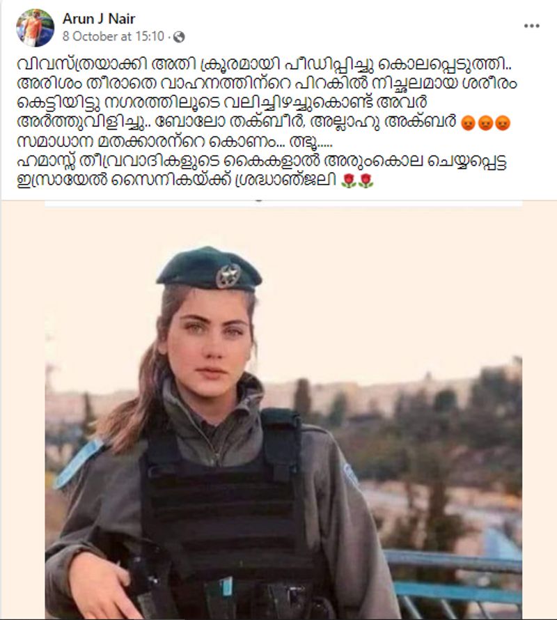 വിവസ്ത്രയാക്കി അതിക്രൂരമായി പീഡിപ്പിച്ചു കൊലപ്പെടുത്തി... അരിശം തീരാതെ വാഹനത്തിന്റെ പിറകിൽ നിച്ഛലമായ ശരീരം കെട്ടിയിട്ടു നഗരത്തിലൂടെ വലിച്ചിഴച്ചുകൊണ്ട് അവർ അർത്തുവിളിച്ചു.. ബോലോ തക്ബീർ, അല്ലാഹു അക്ബർ. സമാധാന മതക്കാരന്റെ കൊണം... ത്ഭൂ... ഹമാസ്സ് തീവ്രവാദികളുടെ കൈകളാൽ അരുംകൊല ചെയ്യപ്പെട്ട ഇസ്രായേൽ സൈനികയ്ക്ക് ശ്രദ്ധാഞ്ജലി എന്നാണ് അരുണ് ജെ നായര് എന്നയാളുടേതായി 2023 ഒക്ടോബര് 8ന് ഫേസ്ബുക്കില് പ്രത്യക്ഷപ്പെട്ട പോസ്റ്റ്. സൈനിക വേഷത്തിലുള്ള ഒരു സ്ത്രീയുടെ ചിത്രവും പോസ്റ്റിനൊപ്പമുണ്ടായിരുന്നു.