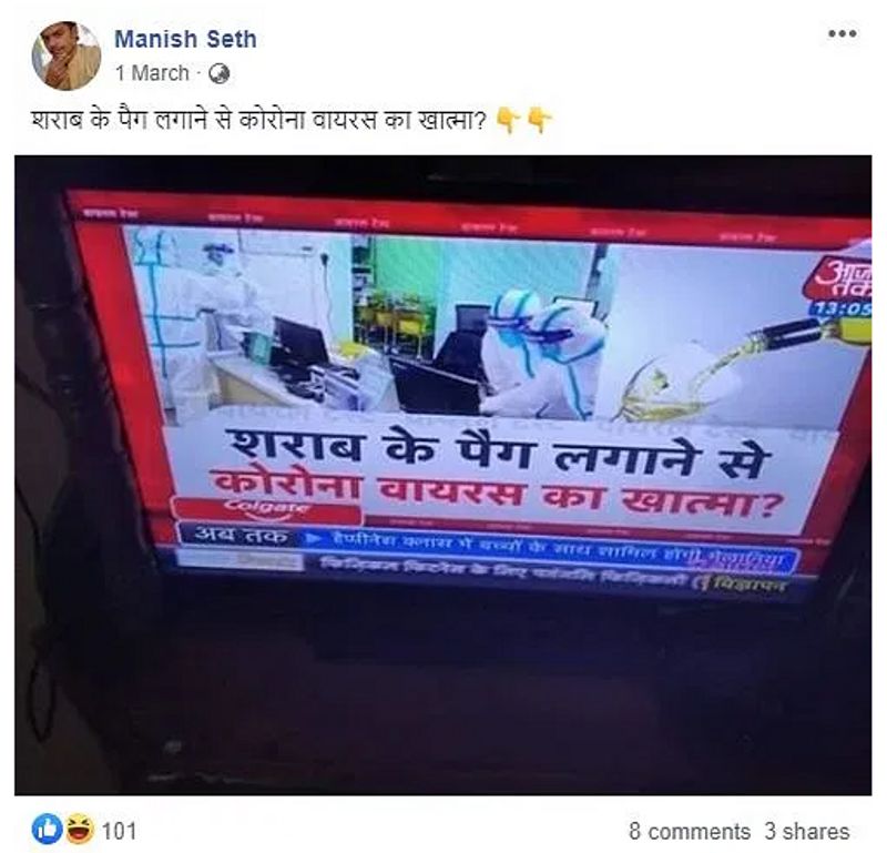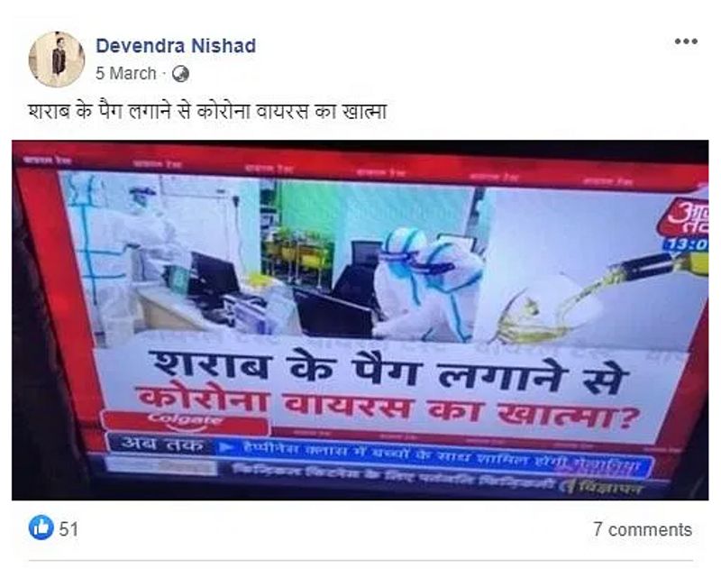 മദ്യം കൊറോണ വൈറസിനെ തുരത്തുമെന്ന് നേരത്തെയും പ്രചാരണമുണ്ടായിരുന്നു. എന്നാല് ഇക്കുറി ഒരു സ്ക്രീന്ഷോട്ട് സഹിതമാണ് പ്രചാരണം. ആജ് തക് ടീവിയില് വന്ന വാര്ത്തയുടെ സ്ക്രീന്ഷോട്ടാണ് ഇത് എന്ന് പറയപ്പെടുന്നു. നിരവധി പേര് ഈ സ്ക്രീന്ഷോട്ട് സാമൂഹ്യമാധ്യമങ്ങളില് ഷെയര് ചെയ്തു.