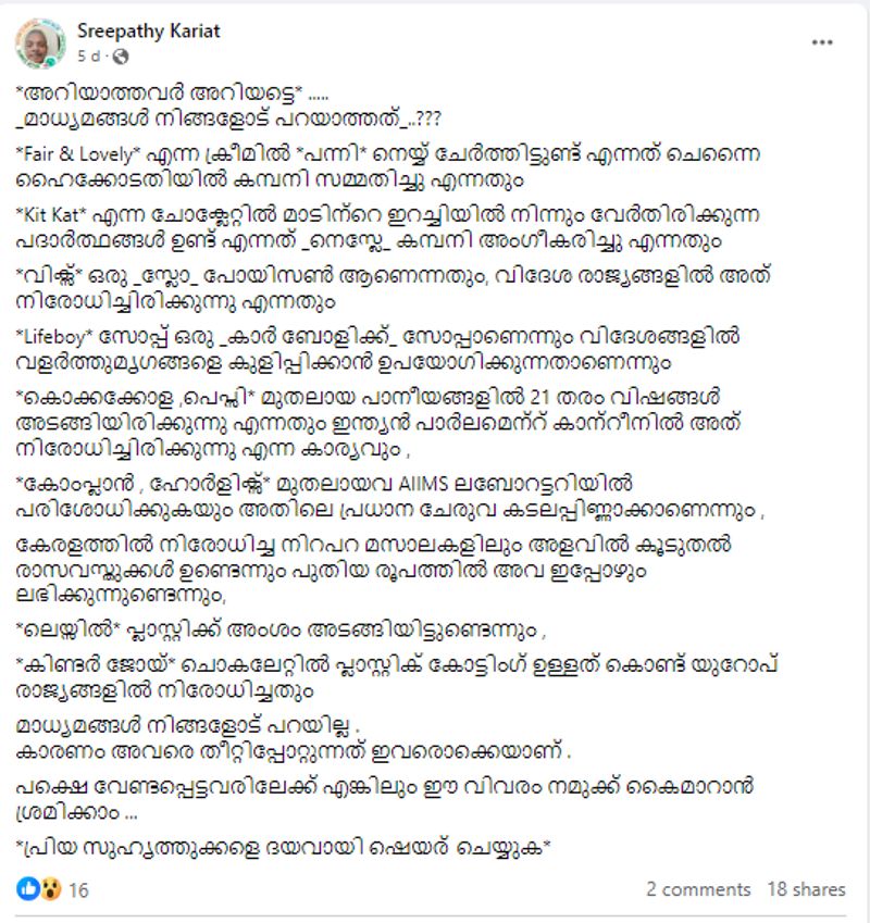 തിരുവനന്തപുരം: 'സൗന്ദര്യ വര്ധക ക്രീമായ ഫെയര് ആന്ഡ് ലവ്ലിയില് (ഇപ്പോള് ഗ്ലോ ആന്ഡ് ലവ്ലി) പന്നി നെയ്യ് ചേർത്തിട്ടുണ്ട്, കിറ്റ്കാറ്റ് ചോക്ക്ലേറ്റില് മാടിന്റെ ഇറച്ചിയിൽ നിന്നും വേർതിരിക്കുന്ന പദാർത്ഥങ്ങൾ ഉണ്ട്, ലെയ്സിൽ പ്ലാസ്റ്റിക്ക് അംശം അടങ്ങിയിട്ടുണ്ട്, വിക്സ് ഒരു സ്ലോപോയിസൺ ആണ്' എന്നിങ്ങനെ നീളുന്ന വലിയൊരു സന്ദേശം വാട്സ്ആപ്പില് പലര്ക്കും കിട്ടിക്കാണും. 'അറിയാത്തവർ അറിയട്ടെ... ഇതൊന്നും മാധ്യമങ്ങൾ നിങ്ങളോട് പറയില്ല. കാരണം, അവരെ തീറ്റിപ്പോറ്റുന്നത് ഇവരൊക്കെയാണ്. പക്ഷേ വേണ്ടപ്പെട്ടവരിലേക്ക് എങ്കിലും ഈ വിവരം നമുക്ക് കൈമാറാൻ ശ്രമിക്കാം'... എന്നിങ്ങനെ നീളുന്നു വൈറല് സന്ദേശത്തിലെ ഭീതിപ്പെടുത്തുന്ന വാക്കുകള്. നാം ഉപയോഗിക്കുന്ന ഈ സാധനങ്ങള് എല്ലാം ഇത്ര അപകടകാരികളായിരുന്നോ? വൈറല് സന്ദേശം സത്യമോ എന്ന് പരിശോധിക്കാം.