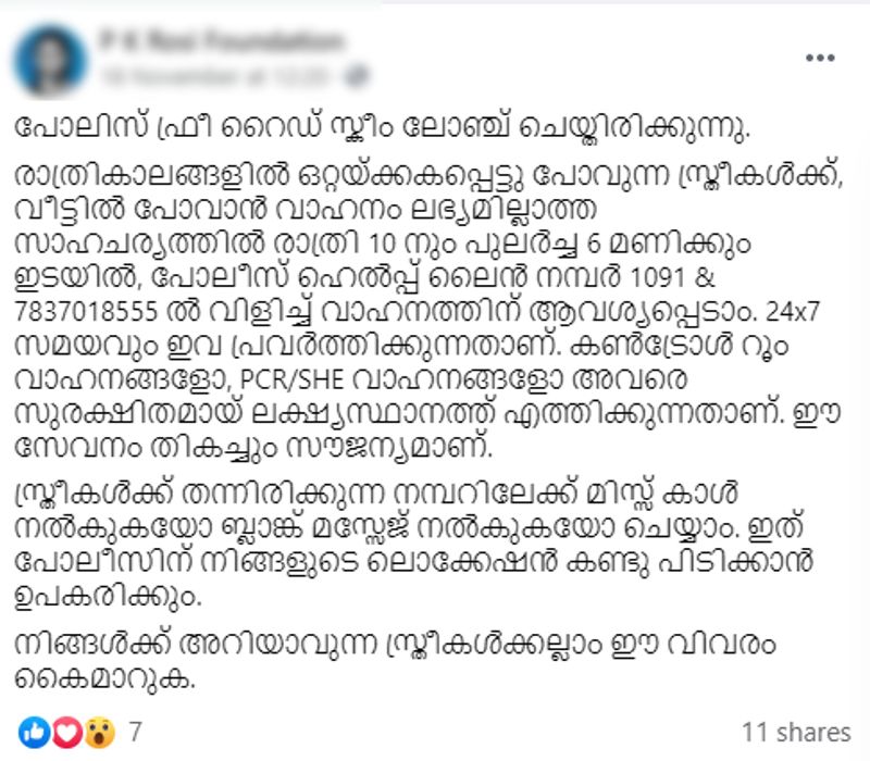 'രാത്രികാലങ്ങളിൽ ഒറ്റപ്പെട്ടുപോവുന്ന സ്ത്രീകൾക്ക്, വീട്ടിൽ പോവാൻ വാഹനം ലഭ്യമില്ലാത്ത സാഹചര്യത്തിൽ രാത്രി 10നും പുലർച്ച ആറ് മണിക്കും ഇടയിൽ, പൊലീസ് ഹെൽപ്പ് ലൈൻ നമ്പർ 1091 & 7837018555ൽ വിളിച്ച് വാഹനത്തിന് ആവശ്യപ്പെടാം. 24x7 സമയവും ഇവ പ്രവർത്തിക്കുന്നതാണ്. കൺട്രോൾ റൂം വാഹനങ്ങളോ, PCR/SHE വാഹനങ്ങളോ അവരെ സുരക്ഷിതമായി ലക്ഷ്യസ്ഥാനത്ത് എത്തിക്കുന്നതാണ്. ഈ സേവനം തികച്ചും സൗജന്യമാണ്. സ്ത്രീകൾക്ക് തന്നിരിക്കുന്ന നമ്പറിലേക്ക് മിസ്കോൾ നൽകുകയോ ബ്ലാങ്ക് മെസേജ് നൽകുകയോ ചെയ്യാം. ഇത് പൊലീസിന് നിങ്ങളുടെ ലൊക്കേഷൻ കണ്ടുപിടിക്കാൻ ഉപകരിക്കും. നിങ്ങൾക്ക് അറിയാവുന്ന സ്ത്രീകൾക്കല്ലാം ഈ വിവരം കൈമാറുക'.