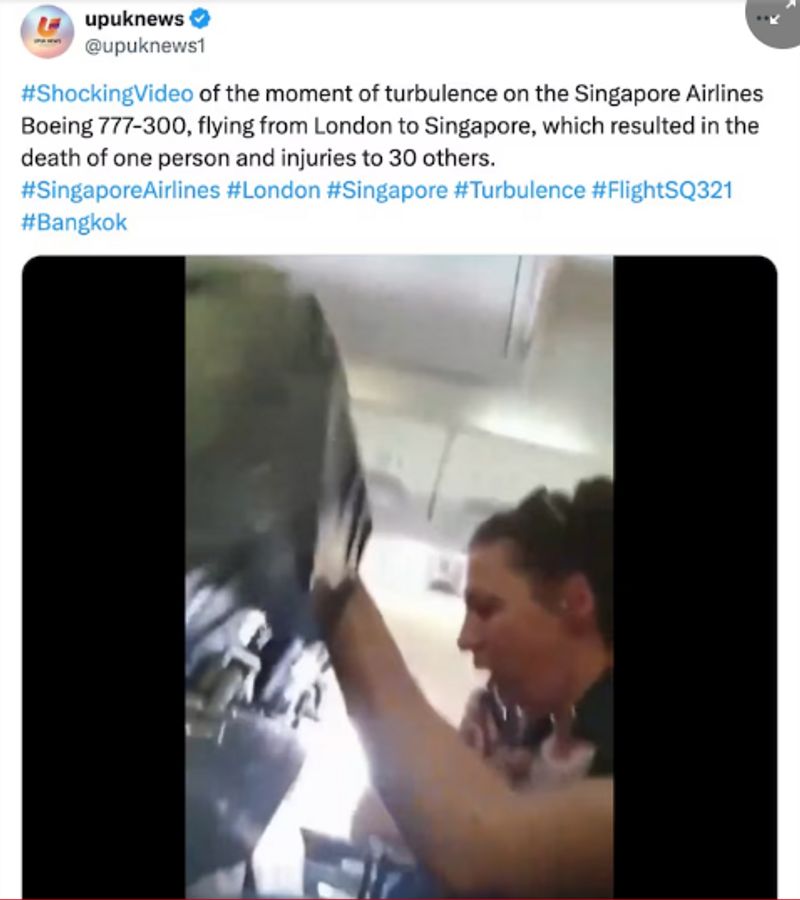 സിംഗപ്പൂർ എയർലൈൻസിന്റെ വിമാനം ഇന്നലെ ആകാശച്ചുഴിയിൽ അകപ്പെട്ടതിനെ തുടര്ന്ന് ഒരാൾക്ക് ജീവൻ നഷ്ടമാവുകയും നിരവധിയാളുകള്ക്ക് പരിക്കേൽക്കുകയും ചെയ്തിരുന്നു. ലണ്ടനിൽ നിന്ന് സിംഗപ്പൂരിലേക്ക് പറക്കവെയാണ് വിമാനം ആകാശച്ചുഴിയില് വീണത്. 229 യാത്രക്കാരുമായി പറക്കുകയായിരുന്ന വിമാനം ഏകദേശം അഞ്ച് മിനിറ്റ് കൊണ്ട് 6000 അടി താഴ്ചയിലേക്ക് എത്തുകയായിരുന്നു. തുടര്ന്ന് വിമാനം അടിയന്തിരമായി ബാങ്കോക്കില് ഇറക്കി. സിംഗപ്പൂർ എയർലൈൻസ് വിമാനം ആകാശച്ചുഴിയില് വീണതിന്റെ എന്ന പേരില് ഒരു വീഡിയോ സോഷ്യല് മീഡിയയില് പ്രചരിക്കുന്നുണ്ട്. ഇത് യഥാര്ഥമോ എന്ന് നോക്കാം.