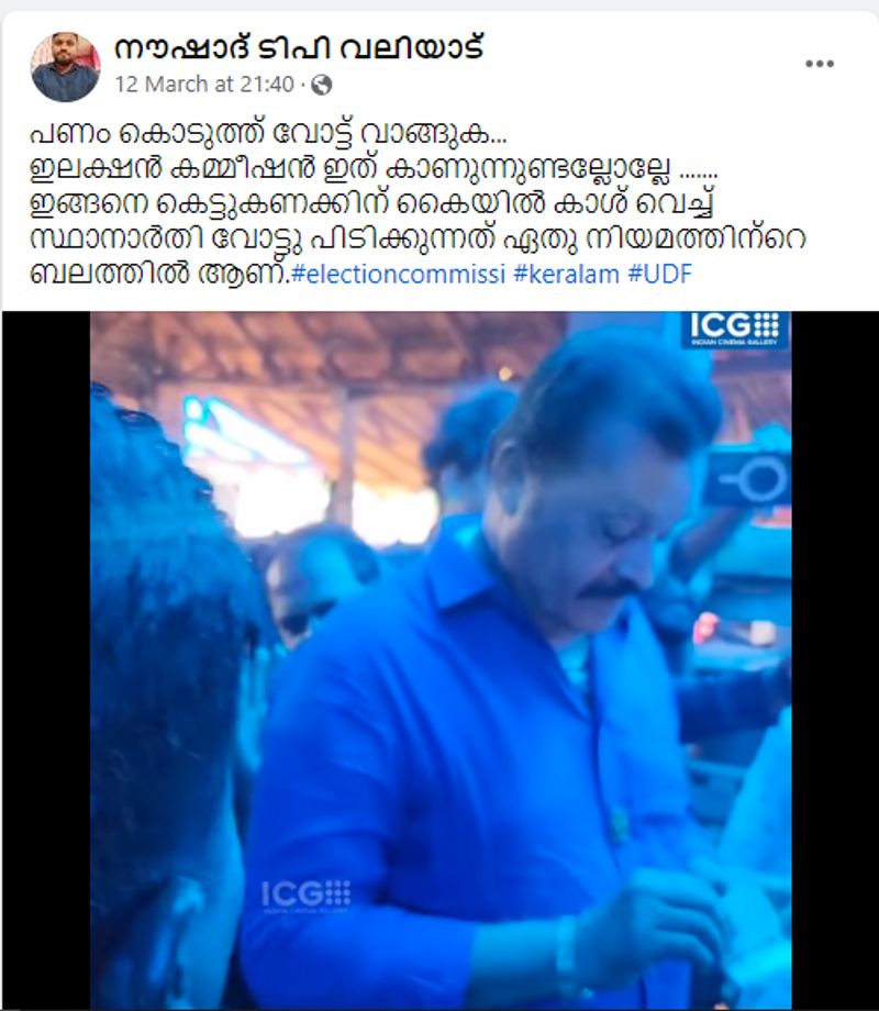 ലോക്സഭ തെരഞ്ഞെടുപ്പില് ശക്തമായ മത്സരം നടക്കുന്ന മണ്ഡലങ്ങളിലൊന്നാണ് തൃശൂര്. ബിജെപിക്കായി നടന് സുരേഷ് ഗോപിയാണ് തൃശൂരില് മത്സരിക്കുന്നത്. സുരേഷ് ഗോപിയുടെ പ്രചാരണം സജീവമായി മണ്ഡലത്തില് നടക്കേ ഒരു വീഡിയോ സാമൂഹ്യമാധ്യമമായ ഫേസ്ബുക്കില് പ്രചരിക്കുകയാണ്. സുരേഷ് ഗോപി പണം കൊടുത്ത് വോട്ടുകള് വാങ്ങുന്നതായാണ് വീഡിയോ പങ്കുവെക്കുന്നവരുടെ അവകാശവാദം. വോട്ടിനായി പണം നല്കുന്നത് കുറ്റകരമായതിനാല് ഈ ദൃശ്യത്തിന്റെ വസ്തുത പരിശോധിക്കാം.