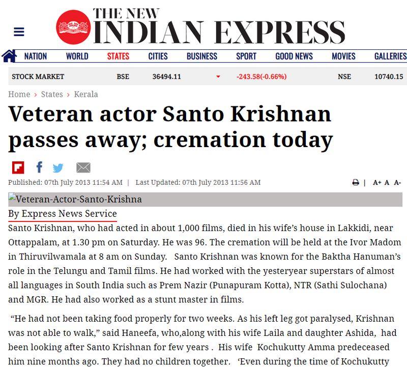 1. സാന്റോ കൃഷ്ണന് അന്തരിച്ചത് 2013ലാണ് എന്ന് അന്നത്തെ മാധ്യമ വാര്ത്തകള് വ്യക്തമാക്കുന്നു. അദേഹത്തിന്റെ നിര്യാണത്തില് ന്യൂ ഇന്ത്യന് എക്സ്പ്രസും ഔട്ട്ലുക്കും നല്കിയ വാര്ത്തകള് ചുവടെ.