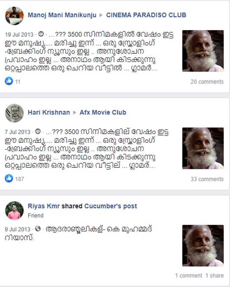 3. 2019ലും സമാന പോസ്റ്റ് ഫേസ്ബുക്കില് വൈറലായിരുന്നു. സാന്റോ കൃഷ്ണന് വിടപറഞ്ഞത് 2013ലാണെന്ന് അന്ന് പലരും ഈ പോസ്റ്റുകളുടെ കമന്റ് ബോക്സില് സൂചിപ്പിച്ചിരുന്നു. എന്നിട്ടും അതേ വരികളാണ് ഇപ്പോള് വീണ്ടും വൈറലായിരിക്കുന്നത്.