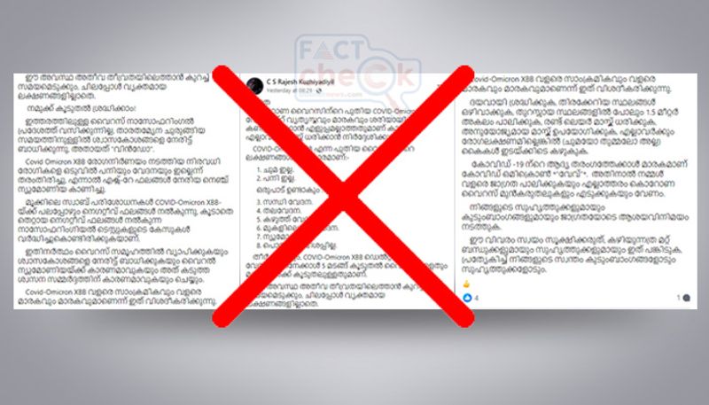 2022ല് ഇംഗ്ലീഷില് പ്രചരിച്ചിരുന്ന സന്ദേശത്തിന്റെ മലയാള പരിഭാഷയാണ് ഇപ്പോള് 2023 ഡിസംബറില് കേരളത്തിലെ പുതിയ കൊവിഡ് സാഹചര്യത്തില് പ്രചരിക്കുന്നത്. അതേസമയം COVID-Omicron XBB അല്ല, കേരളത്തില് ഇപ്പോള് രജിസ്റ്റര് ചെയ്യപ്പെടുന്ന കൊവിഡ് കേസുകളില് സ്ഥിരീകരിച്ചിരിക്കുന്നത് ജെഎന്.1 എന്ന കൊവിഡിന്റെ ഉപവകഭേദമാണ് എന്നും ഏവരും മനസിലാക്കേണ്ടതാണ്. കൊവിഡ് കേസുകളിൽ വർധനയുണ്ടെങ്കിലും ആശങ്കപ്പെടേണ്ട സാഹചര്യം നിലവിലില്ല എന്നാണ് കേരളത്തിന്റെ വിലയിരുത്തൽ. കൊവിഡ് സംബന്ധിയായ സന്ദേശങ്ങള് സാമൂഹ്യമാധ്യമങ്ങളില് ഷെയര് ചെയ്യും മുമ്പ് വസ്തുതകള് കൃത്യമായി പരിശോധിക്കാന് ശ്രമിക്കേണ്ടതാണ്. ആരോഗ്യവിദഗ്ധര് നല്കുന്ന ജാഗ്രതാ നിര്ദേശങ്ങള് കൃത്യമായി പാലിക്കാനും ശ്രദ്ധിക്കുക.