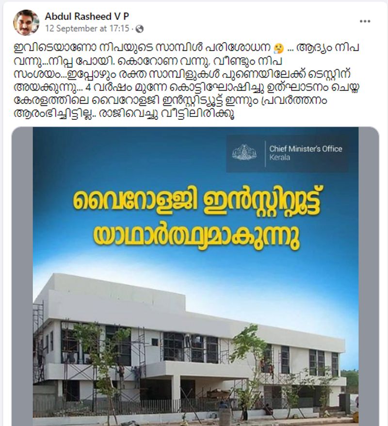 തിരുവനന്തപുരം: കേരളത്തില് വീണ്ടും നിപ സ്ഥിരീകരിച്ചതിന് പിന്നാലെ ഒരു പ്രചാരണം സജീവമായിരിക്കുകയാണ്. കേരളത്തില് വൈറോളജി ഇന്സ്റ്റിറ്റ്യൂട്ട് ആരംഭിച്ചു എന്ന് സര്ക്കാര് അവകാശപ്പെട്ടിട്ടും നിപ പരിശോധനയ്ക്കായി എന്തിന് പൂനെയിലേക്ക് സാംപിള് അയക്കുന്നു എന്നതാണ് വിമര്ശകര് ഉന്നയിക്കുന്ന ചോദ്യം. ഇക്കാര്യം ചോദിച്ചുകൊണ്ട് നിരവധി പേരാണ് ഫേസ്ബുക്കിലും എക്സിലും(ട്വിറ്റര്) രംഗത്തെത്തിയത്. ഇതിന് പിന്നാലെ കേരളത്തിലെ വൈറോളജി ലാബുകളിലെ സൗകര്യങ്ങള് വ്യക്തമാക്കി കേരള സര്ക്കാരിന് കീഴിലുള്ള ഫാക്ട് ചെക്ക് വിഭാഗം രംഗത്തെത്തി.