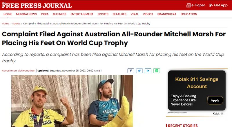 ഏകദിന ലോകകപ്പ് ട്രോഫിക്ക് മുകളില് കാല് വച്ചതിന് ഉത്തര്പ്രദേശിലെ അലിഗഢില് മിച്ചല് മാര്ഷിനെതിരെ എഫ്ഐആര് രജിസ്റ്റര് ചെയ്തതായി വിവിധ മാധ്യമങ്ങളാണ് വാര്ത്ത റിപ്പോര്ട്ട് ചെയ്തത്. ഫ്രീപ്രസ് ജേണലും, മിന്റും, ഒപ്ഇന്ത്യയും ഈ വാര്ത്ത നല്കിയ വെബ്സൈറ്റുകളുടെ പട്ടികയിലുണ്ട്. ഇതേ വാര്ത്ത സാമൂഹ്യമാധ്യമമായ ട്വിറ്ററിലും കാണാം.