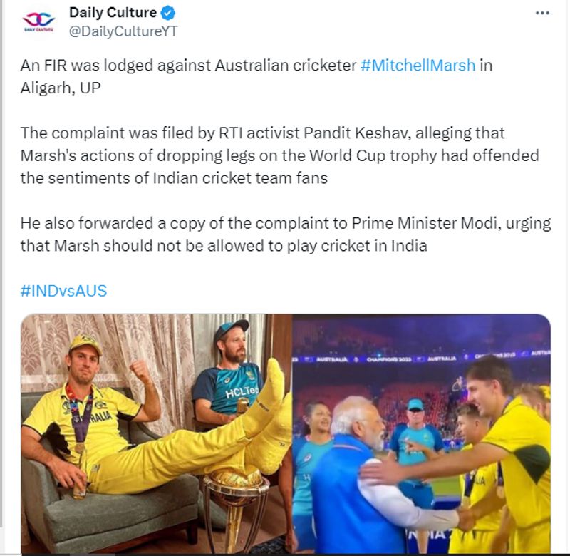 ഏകദിന ക്രിക്കറ്റ് ലോകകപ്പ് ഫൈനലില് ടീം ഇന്ത്യയെ പരാജയപ്പെടുത്തിയ ശേഷം ഓസ്ട്രേലിയന് ഓള്റൗണ്ടര് മിച്ചല് മാര്ഷ് ട്രോഫിക്ക് മുകളില് കാല് കയറ്റി വച്ച് ഫോട്ടോയ്ക്ക് പോസ് ചെയ്തത് വിവാദമായിരുന്നു. മാര്ഷ് ലോകകപ്പ് ട്രോഫിയെ അപമാനിച്ചു എന്നായിരുന്നു ഇന്ത്യന് ആരാധകരുടെ പ്രതികരണം. സംഭവത്തില് മാര്ഷിനെതിരെ സാമൂഹ്യമാധ്യമങ്ങളില് സൈബര് ആക്രമണം നടന്നിരുന്നു. ഇതിന് പിന്നാലെ മിച്ചല് മാര്ഷിനെതിരെ ഉത്തര്പ്രദേശില് എഫ്ഐആര് രജിസ്റ്റര് ചെയ്തോ? ചെയ്തു എന്നാണ് വാര്ത്തകള്. ഇതിന്റെ വസ്തുത എന്താണ് എന്ന് നോക്കാം.