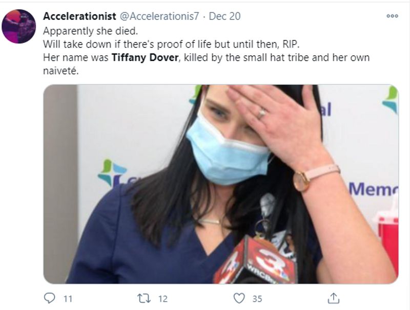 കൊവിഡ് 19 വാക്സിന് സ്വീകരിച്ച നഴ്സ് ടിഫാനി ഡോവര് കുഴഞ്ഞുവീഴുകയും പിന്നാലെ മരണപ്പെടുകയും ചെയ്തു എന്നാണ് ഫേസ്ബുക്കിലെ ഒരു പോസ്റ്റില് പറയുന്നത്. ഫൈസര് വാക്സിന് എടുത്ത് 15 മിനുറ്റുകള്ക്ക് ശേഷമാണ് ടിഫാനി കുഴഞ്ഞുവീണതെന്ന് വീഡിയോ സഹിതമുള്ള പ്രചാരണത്തില് പറയുന്നു.