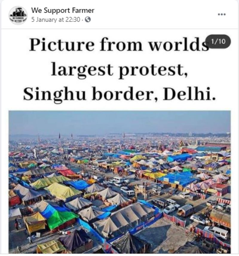 തുറസ്സായസ്ഥലത്തുള്ള നൂറുകണക്കിന് ടെന്റുകളുടെ ആകാശചിത്രമാണ് സാമൂഹ്യമാധ്യമങ്ങളില് പ്രചരിക്കുന്നത്. 'സിംഗു അതിര്ത്തിയില് നടക്കുന്ന ലോകത്തിലെ ഏറ്റവും വലിയ പ്രതിഷേധം' എന്ന തലക്കെട്ടും കാണാം.