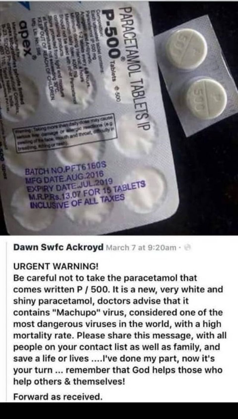 P-500 എന്ന പാരസെറ്റമോള് കഴിക്കരുത് എന്നാവശ്യപ്പെട്ടാണ് സാമൂഹ്യമാധ്യമമായ വാട്സ്ആപ്പില് സന്ദേശം വ്യാപകമായി പ്രചരിക്കുന്നത്. ഈ പാരസെറ്റമോളില് Machupo എന്ന മാരക വൈറസ് അടങ്ങിയിരിക്കുന്നു എന്ന് സന്ദേശത്തില് പറയുന്നു. 'P-500 എന്ന് എഴുതിയിട്ടുള്ള പാരസെറ്റമോള് ആരും കഴിക്കരുത്. ഈ ഗുളികയില് Machupo വൈറസ് അടങ്ങിയിട്ടുണ്ട് എന്ന് ഡോക്ടര്മാര് കണ്ടെത്തിയിട്ടുണ്ട്. ലോകത്തെ ഏറ്റവും അപകടകാരിയായ വൈറസുകളിലൊന്നാണ് Machupo. മരണനിരക്ക് വളരെ കൂടുതലാണ്. ഇക്കാര്യം എല്ലാവരിലും ഷെയര് ചെയ്ത് എത്തിക്കുക, അങ്ങനെ ജീവന് രക്ഷിക്കുക. ഞാന് ഷെയര് ചെയ്തുകഴിഞ്ഞു. മറ്റുള്ളവരെ സഹായിക്കുന്നവരെ ദൈവം സഹായിക്കും' എന്നും പ്രചരിക്കുന്ന സന്ദേശത്തില് എഴുതിയിരിക്കുന്നു. പാരസെറ്റമോള് P-500ന്റെ ചിത്രം സഹിതമാണ് പ്രചാരണം.