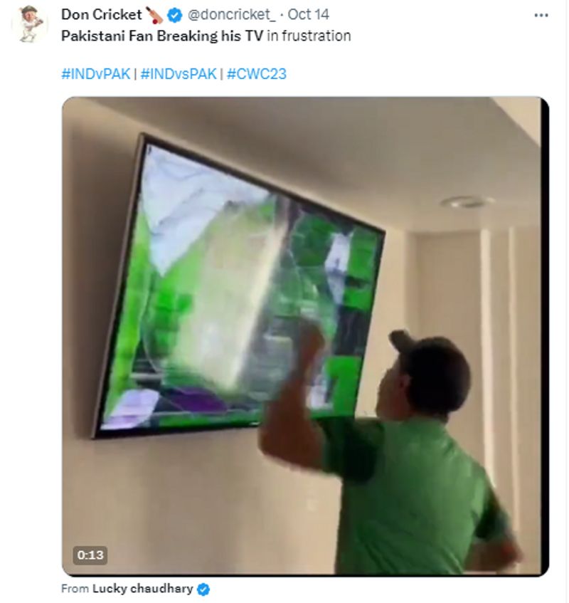 ഡോണ് ക്രിക്കറ്റ് എന്ന ട്വിറ്റര് ഹാന്ഡിലില് നിന്ന് 2023 ഒക്ടോബര് 14-ാം തിയതി വന്ന ട്വീറ്റ് ഇങ്ങനെ. 'കടുത്ത നിരാശ കാരണം പാകിസ്ഥാന് ആരാധകന് ടിവി തല്ലിത്തകര്ക്കുന്നു' എന്ന കുറിപ്പോടെയാണ് വീഡിയോ പങ്കുവെച്ചിരിക്കുന്നത്. ക്രിക്കറ്റ് ലോകകപ്പുമായും ഇന്ത്യ-പാകിസ്ഥാന് മത്സരവുമായും ബന്ധപ്പെട്ട #INDvPAK #INDvsPAK #CWC23 എന്നീ ഹാഷ്ടാഗുകളും ട്വീറ്റിനൊപ്പമുണ്ട്. ടിവി ഇടിച്ചുപൊളിച്ചിട്ടും കലിപ്പ് തീരാതെ കത്തിയെടുത്ത് സ്ക്രീന് ഇയാള് കുത്തിപ്പൊളിക്കുന്നതും വാവിട്ട് കരയുന്നതും ഡോണ് ക്രിക്കറ്റ് ട്വീറ്റ് ചെയ്ത വീഡിയോയിലുണ്ട്. ഇതേ വീഡിയോ മറ്റ് നിരവധി ട്വിറ്റര് ഹാന്ഡിലുകളില് നിന്നും ഒക്ടോബര് 14-ാം തിയതി ട്വീറ്റ് ചെയ്തിരുന്നു. ഇന്ത്യക്കെതിരായ തോല്വിയില് പ്രകോപിതനായ പാക് ആരാധകന് ടിവി തല്ലിപ്പൊളിക്കുന്നു എന്ന തലക്കെട്ടോടെയാണ് ഈ ട്വീറ്റുകളെല്ലാം. ട്വീറ്റുകളുടെ ലിങ്കുകള് 1, 2, 3, 4, 5.