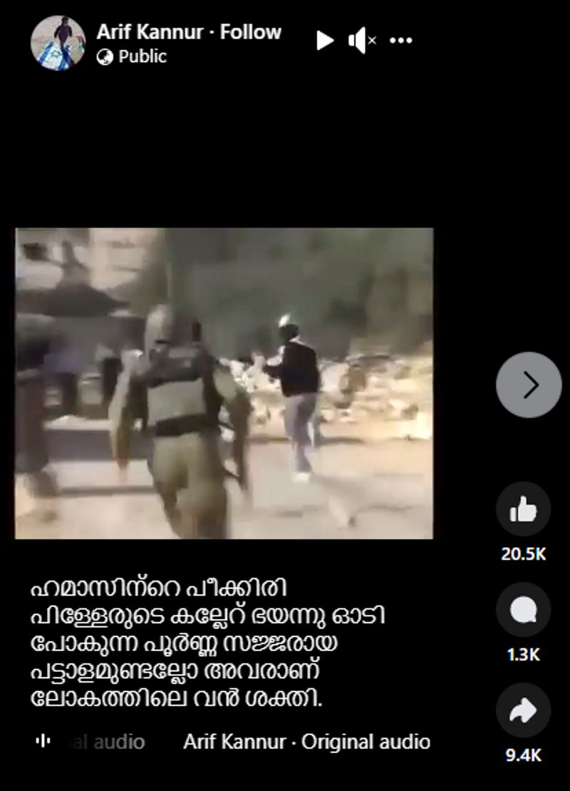 'ഹമാസിന്റെ പീക്കിരി പിള്ളേരുടെ കല്ലേറ് ഭയന്നു ഓടി പോകുന്ന പൂർണ്ണ സജ്ജരായ പട്ടാളമുണ്ടല്ലോ അവരാണ് ലോകത്തിലെ വൻ ശക്തി' എന്ന കുറിപ്പോടെയാണ് വീഡിയോ അന്സാരി അന്സാരി പിഎ എന്നയാള് ഫേസ്ബുക്കില് പോസ്റ്റ് ചെയ്തിരിക്കുന്നത്. 2023 ഒക്ടോബര് 10നാണ് ഈ പോസ്റ്റ് പ്രത്യക്ഷപ്പെട്ടത്. കല്ലെറിയുന്നവര്ക്ക് അടുത്തേക്ക് പാഞ്ഞടുക്കുന്ന സൈനികരിലൊരാള് കാല്വഴുതി വീഴുന്നത് ഈ ദൃശ്യങ്ങളില് കാണാം. സഖാവ് ജലീൽ ഭായ് എന്ന അക്കൗണ്ടുകളില് നിന്നും ഫേസ്ബുക്കില് വീഡിയോ പോസ്റ്റ് ചെയ്തിട്ടുണ്ട്. ഇതേ വീഡിയോ ആരിഫ് കണ്ണൂര് എന്നയാള് റീല്സായും എഫ്ബിയില് പോസ്റ്റ് ചെയ്തത് കാണാം. വീഡിയോകള് ഏറെ പ്രചരിക്കുന്നുണ്ട് എന്ന് മനസിലാക്കിയതിനാല് ദൃശ്യത്തിന്റെ വസ്തുത എന്താണ് എന്ന് പരിശോധനയ്ക്ക് വിധേയമാക്കി.
