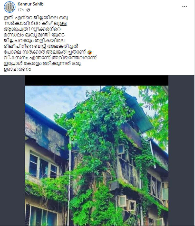 'ഇത് എന്റെ ജില്ലയിലെ ഒരു സർക്കാരിന്റെ കീഴിലുള്ള ആശുപത്രി. സ്പീക്കറിന്റെ മണ്ഡലം. മുഖ്യമന്ത്രിയുടെ ജില്ല. പറക്കും തളികയിലെ ദിലീപിന്റെ ബസ്സ് അലങ്കരിച്ചത് പോലെ സർക്കാർ അലങ്കരിച്ചതാണ്. വികസനം എന്താണ് അറിയാത്തവരാണ് ഇപ്പോൾ കേരളം ഭരിക്കുന്നത്. ഒരു ഉദാഹരണം'- എന്നുമാണ് കണ്ണൂര് സാഹിബ് എന്നയാളുടെ ഫേസ്ബുക്ക് പോസ്റ്റില് പറയുന്നത്.