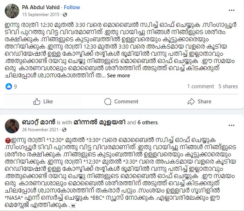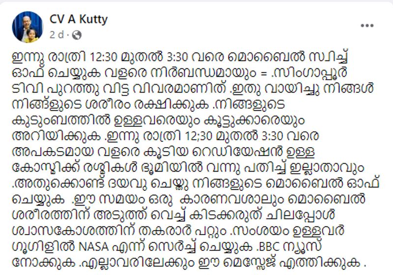 ഫേസ്ബുക്കിലും വാട്സ്ആപ്പിലും വീണ്ടും വൈറലായിരിക്കുകയാണ് കോസ്മിക് രശ്മികളെ കുറിച്ചുള്ള സന്ദേശം. ഫേസ്ബുക്കില് സി.വി എ കുട്ടി എന്നയാള് 2023 ഒക്ടോബര് 16ന് പോസ്റ്റ് ചെയ്ത സന്ദേശം ഇങ്ങനെ... 'ഇന്നു രാത്രി 12:30 മുതൽ 3:30 വരെ മൊബൈൽ സ്വിച്ച് ഓഫ് ചെയ്യുക വളരെ നിർബന്ധമായും. സിംഗപ്പൂർ ടിവി പുറത്തുവിട്ട വിവരമാണിത്. ഇതു വായിച്ചു നിങ്ങൾ നിങ്ങളുടെ ശരീരം രക്ഷിക്കുക. നിങ്ങളുടെ കുടുംബത്തിൽ ഉള്ളവരെയും കൂട്ടുകാരെയും അറിയിക്കുക. ഇന്നു രാത്രി 12:30 മുതൽ 3:30 വരെ അപകടമായ വളരെ കൂടിയ റെഡിയേഷൻ ഉള്ള കോസ്മിക്ക് രശ്മികൾ ഭൂമിയിൽ വന്നു പതിച്ച് ഇല്ലാതാവും. അതുക്കൊണ്ട് ദയവു ചെയ്തു നിങ്ങളുടെ മൊബൈൽ ഓഫ് ചെയ്യുക. ഈസമയം ഒരു കാരണവശാലും മൊബൈൽ ശരീരത്തിന് അടുത്ത് വെച്ച് കിടക്കരുത്. ചിലപ്പോൾ ശ്വാസകോശത്തിന് തകരാർ പറ്റും. സംശയം ഉള്ളവർ ഗൂഗിളിൽ NASAഎന്ന് സെർച്ച് ചെയ്യുക. BBCന്യൂസ് നോക്കുക. എല്ലാവരിലേക്കും ഈ മെസ്സേജ് എത്തിക്കുക'.