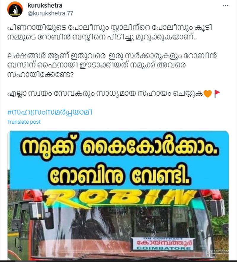 റോബിന് ബസിന് നീതി ലഭിക്കാന് സാമ്പത്തിക സഹായവുമായി നമുക്ക് കൈകോര്ക്കാം എന്നുപറഞ്ഞാണ് പോസ്റ്റര് പ്രചാരണം സോഷ്യല് മീഡിയയില് വ്യാപകമായിരിക്കുന്നത്. കുരുക്ഷേത്ര എന്ന എക്സ് (പഴയ ട്വിറ്റര്) അക്കൗണ്ടില് 2023 നവംബര് 21-ാം തിയതി വന്ന ട്വീറ്റിലെ വിവരങ്ങള് ഇങ്ങനെ...'പിണറായിയുടെ പൊലീസും സ്റ്റാലിന്റെ പൊലീസും കൂടി നമ്മുടെ റോബിൻ ബസിനെ പിടിച്ചു മുറുക്കുകയാണ്. ലക്ഷങ്ങൾ ആണ് ഇതുവരെ ഇരു സർക്കാരുകളും റോബിൻ ബസിന് ഫൈനായി ഈടാക്കിയത്. നമുക്ക് അവരെ സഹായിക്കേണ്ടേ? എല്ലാ സ്വയം സേവകരും സാധ്യമായ സഹായം ചെയ്യുക'. നമുക്ക് കൈകോര്ക്കാം റോബിനു വേണ്ടി എന്ന എഴുത്തും ബസിന്റെ ചിത്രവും ബാങ്ക് അക്കൗണ്ട് വിവരങ്ങളും ട്വീറ്റിനോടൊപ്പമുണ്ട്. സമാന ആഹ്വാനമുള്ള പോസ്റ്റുകള് ഫേസ്ബുക്കിലും പ്രത്യക്ഷപ്പെട്ടിട്ടുണ്ട്.