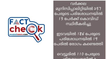 'വര്ക്കല മുന്സിപ്പാലിറ്റിയില് 257 പേര്ക്ക് നടത്തിയ പരിശോധനയില് 13 പേര്ക്ക് കൊവിഡ് 19 സ്ഥിരീകരിച്ചു. ഇടവയില് 184 പേരുടെ പരിശോധനയില് 19 പേരില് കൊവിഡ് സ്ഥിരീകരിച്ചു. വെട്ടൂരില് 110 പേരുടെ പരിശോധനയില് 2 പേര്ക്ക് രോഗം സ്ഥിരീകരിച്ചു' എന്നാണ് സമൂഹമാധ്യമങ്ങളില് വ്യാപകമാവുന്ന പ്രചാരണം. വാട്ട്സ്ആപ്പ്, ഫേസ്ബുക്ക് അടക്കമുള്ള മാധ്യമങ്ങളില് ഈ കുറിപ്പ് വ്യാപകമായി പ്രചരിച്ചു. സംസ്ഥാനത്ത് കൊവിഡ് 19 വ്യാപകമാവുന്നതിന് ഇടയില് നടന്ന പ്രചാരണം നിരവധിപ്പേരെയാണ് ആശങ്കയിലാക്കിയത്.