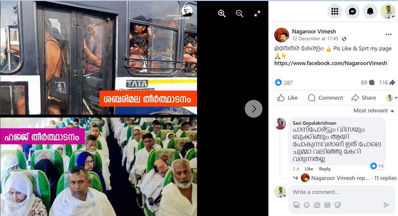 'മതേതര കേരളം 👍 Pls Like & Sprt my page 🙏👇' എന്ന തലക്കെട്ടോടെ നാഗാവൂർ വിമേഷ് എന്നയാളുടെ ഫേസ്ബുക്ക് പേജില് വന്ന ചിത്രം ഇങ്ങനെ. രണ്ട് ഫോട്ടോകളുള്ള കൊളാഷാണ് വിമേഷ് എഫ്ബിയില് പങ്കുവെച്ചിരിക്കുന്നത്. 'ശബരിമല തീർഥാടനം' എന്ന അടിക്കുറിപ്പോടെയുള്ള ആദ്യ ഫോട്ടോയില് കാണുന്നത് ബസില് തിങ്ങിനിറഞ്ഞ് അയ്യപ്പഭക്തന്മാർ യാത്ര ചെയ്യുന്നതാണ്. ഹജ്ജ് കർമ്മം നിർവഹിക്കാന് പോകുന്ന തീർഥാടകർ സീറ്റിംഗ് കപ്പാസിറ്റിക്ക് അനുസരിച്ച് മാത്രം ആളുകളുള്ള വാഹനത്തില് (വിമാനം) പോകുന്നതാണ് രണ്ടാമത്തെ ഫോട്ടോയില്. 'ഹജജ് തീർഥാടനം' എന്നാണ് ഈ ചിത്രത്തിന്റെ അടിക്കുറിപ്പ്.