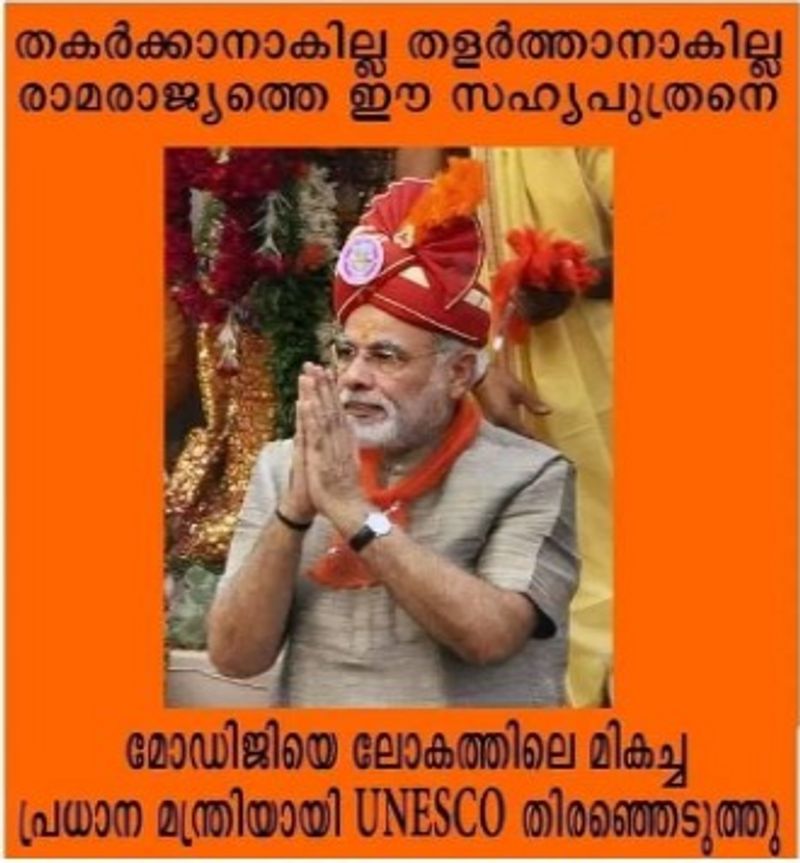 'തകര്ക്കാനാകില്ല തളര്ത്താനാകില്ല രാമരാജ്യത്തെ ഈ സഹ്യപുത്രനെ. മോഡിജിയെ ലോകത്തിലെ മികച്ച പ്രധാന മന്ത്രിയായി UNESCO തെരഞ്ഞെടുത്തു'- എന്നാണ് പ്രചരിക്കുന്ന ഒരു സന്ദേശം. രതീഷ് ആര് എന്നയാളാണ് ഈ പോസ്റ്റ് എഫ്ബിയില് പോസ്റ്റ് ചെയ്തിരിക്കുന്നത്.